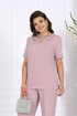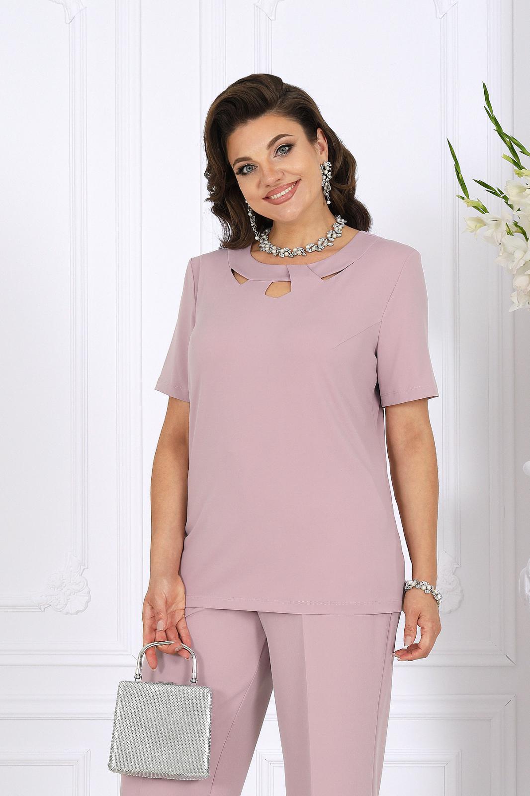 Блузка полуприлегающего силуэта, выполнена из трикотажного полотна «масло». Модель без плечевых накладок. Горловина округлой формы, спереди оформлена фигурным вырезом и отрезной бейкой. Рукав короткий, втачной. Длина блузки – 63 см; длина рукава – 23 см.