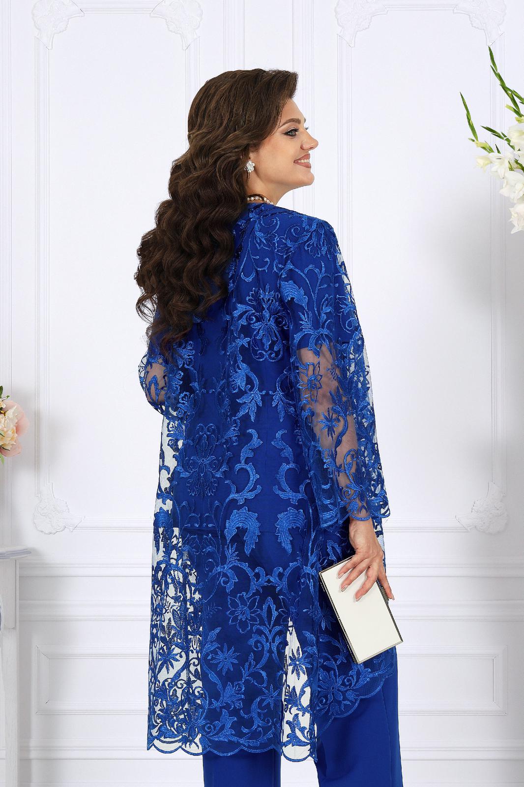 Воздушный гипюровый кардиган прямого силуэта с удлинённой спинкой и фигурными фестонами по краю создаёт лёгкость и утончённость образа. Полуприлегающая блузка из эластичного трикотажа «масло» мягко повторяет линии фигуры, не сковывая движения. Классические прямые брюки из костюмно-плательной ткани со стрелками визуально вытягивают силуэт, формируя изящные пропорции и обеспечивая комфорт в течение всего дня.