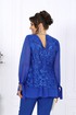 Блузка прямого силуэта, комбинированная. Модель двухслойная: верхний слой выполнен из гипюра с фестонами, нижний – из шифона. На верхней детали переда обработаны нагрудные вытачки, на верхней детали спинки – талиевые. В среднем шве спинки предусмотрена застежка на потайную тесьму-«молнию» (50см). Вырез горловины переда и спинки округлый, углубленный спереди. Рукав длинный, втачной, со сборкой по низу и притачной манжетой с завязками. Длина блузки – 74 см, длина рукава (с манжетой) – 59 см.