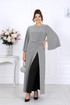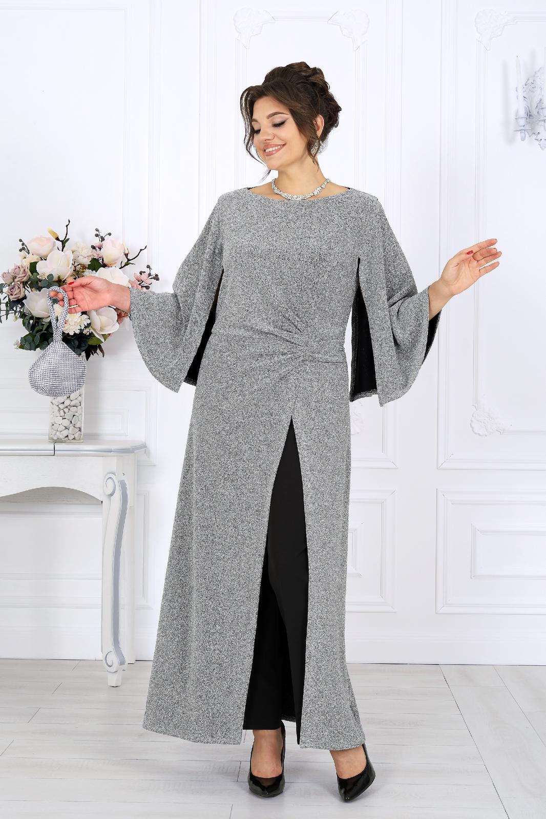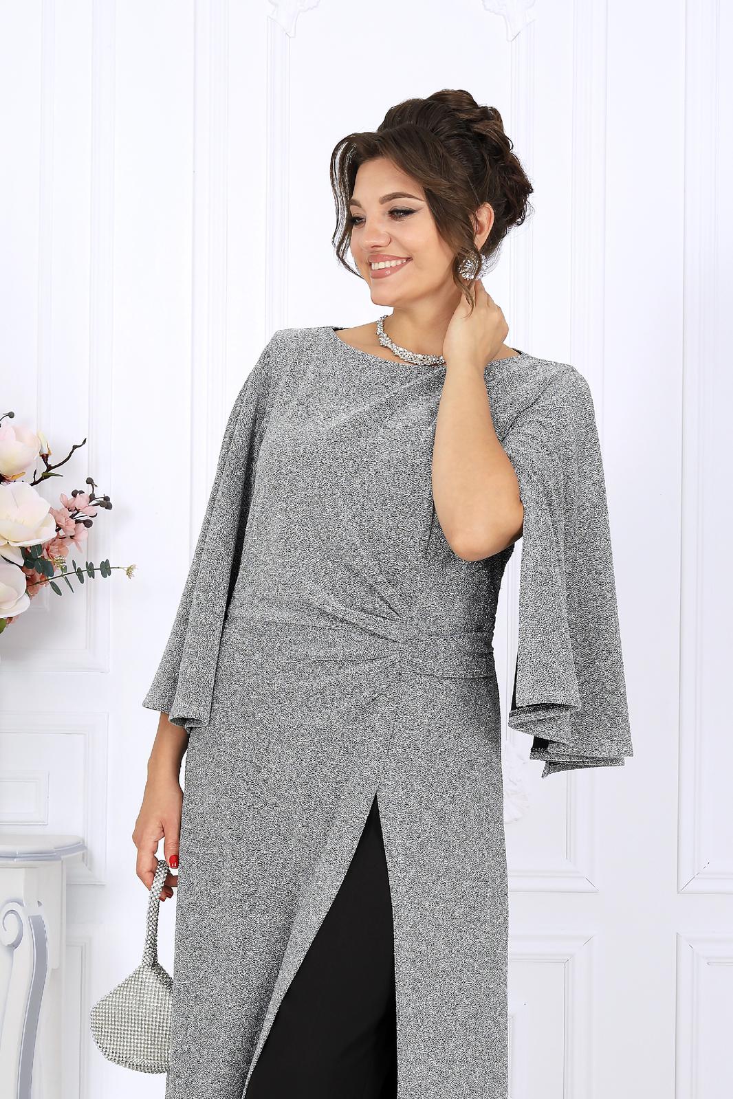 Туника полуприлегающего силуэта с расширением к низу, выполнена из трикотажного полотна с фактурной лицевой стороной «люрекс». Модель отрезная по линии талии; верхняя часть переда и спинки (лиф) на трикотажной подкладке. Лиф переда с одним рельефным швом, направленным от левой проймы; нижняя часть переда состоит из двух деталей, скрепленных на запах. По линии талии, вдоль рельефа, перед задрапирован сборкой и односторонними складками. На спинке обработаны талиевые вытачки и средний шов с застежкой на потайную тесьму-«молнию» (50 см). Вырез горловины спинки и переда формы «лодочка». Рукав без шва, с отлетными краями; крепится к пройме только в верхней части. Длина туники – 139 см; длина рукава – 51 см.