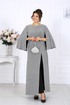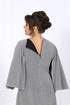 Туника свободно струится по фигуре, легко скрывая всё лишнее и подчеркивая достоинства. Драпировка по линии талии формирует красивый силуэт «песочных часов», а асимметричный запах добавляет образу динамики и утончённости. Эффектные рукава придают наряду торжественность, сохраняя при этом абсолютную лёгкость движений. Каждая деталь продумана до мелочей — от мягкой подкладки, обеспечивающей комфорт, до аккуратной потайной застёжки, сохраняющей чистоту линий.