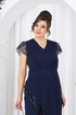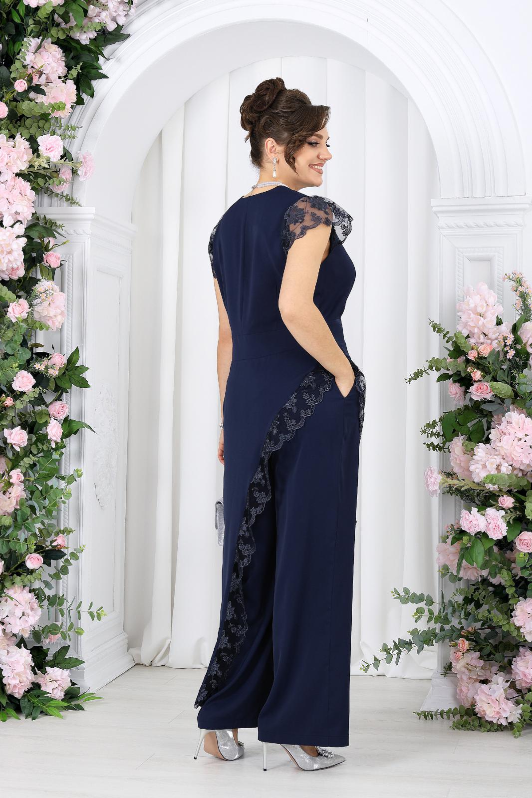 Туника полуприлегающего силуэта, выполнена из костюмно-плательной ткани. Модель без подкладки, в левом боковом потайная молния. По спинке горловина округлой формы, а по переду V – образная, обработана обтачкой. Туника отрезная по линии талии. Лиф туники и нижняя часть соединены по талии притачным поясом. На полочке и спинке обработаны талиевые вытачки. Боковые швы блузы ассиметричны, правый боковой фигурной формы и в качестве отделки по краю среза использовано кружево. Рукава «крылышки» из кружева. Длина туники (спинка) – 138 см (50-58 р-р).