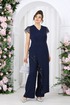 Брюки, длинные, с посадкой на талии, выполнены из костюмно-плательной ткани. Модель без стрелок. Передние и задние половинки брюк с талиевыми вытачками, направленными от пояса вниз. Спереди обработаны наклонные боковые карманы и центральная застёжка на тесьму-«молнию». Притачной пояс застегивается на 1 петлю и 1 пуговицу; для лучшего прилегания по линии талии в притачном поясе предусмотрена эластичная лента, вставленная по спинке. Длина брюк по боковому (с поясом) –107 см (50-52 р-р), 108 см (54-58 р-р).