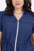 Блузка прямого силуэта, выполнена из вискозного полотна. Модель с втачным рукавом и плечевыми накладками. Перед с центральной застежкой на разъёмную тесьму «молнию». По переду и спинке блузки оформлены кокетки. По переду блузки настрочены накладные карманы с клапанами, входящими в шов кокетки. Горловина V – образная, оформлена отложным воротником. По линии талии предусмотрена кулиса с протянутой внутрь широкой эластичной лентой и шнуром, выполненным из основной ткани. Шнур регулируется металлическими фиксаторами, а на конце его закреплены металлические наконечники. Рукав втачной короткий. Длина блузки –66,0 см (50-58 р-р); длина рукава –21,0 см (50-58 р-р).