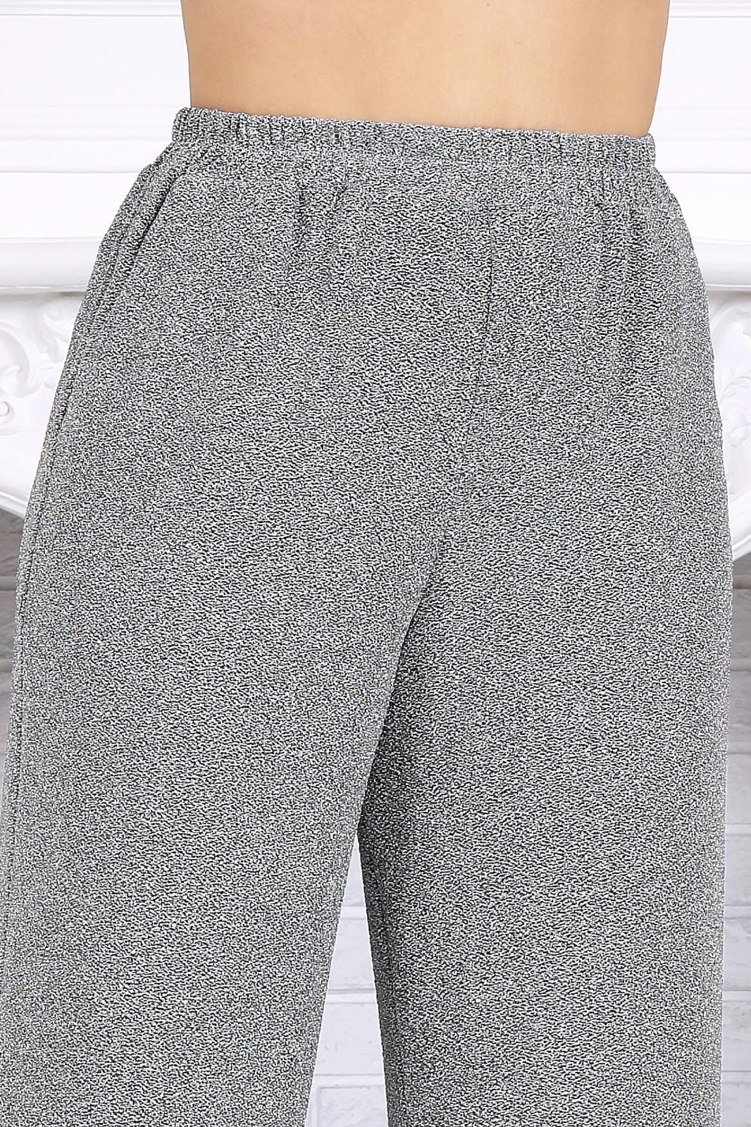 Брюки длинные, с посадкой на талии, выполнены из трикотажного полотна с фактурной лицевой стороной «люрекс». Модель без стрелок, без застежки. Спереди обработаны наклонные боковые карманы. Для лучшего прилегания по линии талии в притачном поясе предусмотрена широкая эластичная лента, вставленная по всей длине. Длина брюк по боковому (с поясом) –107 см (50-52 р-р), 108 см (54-58 р-р).