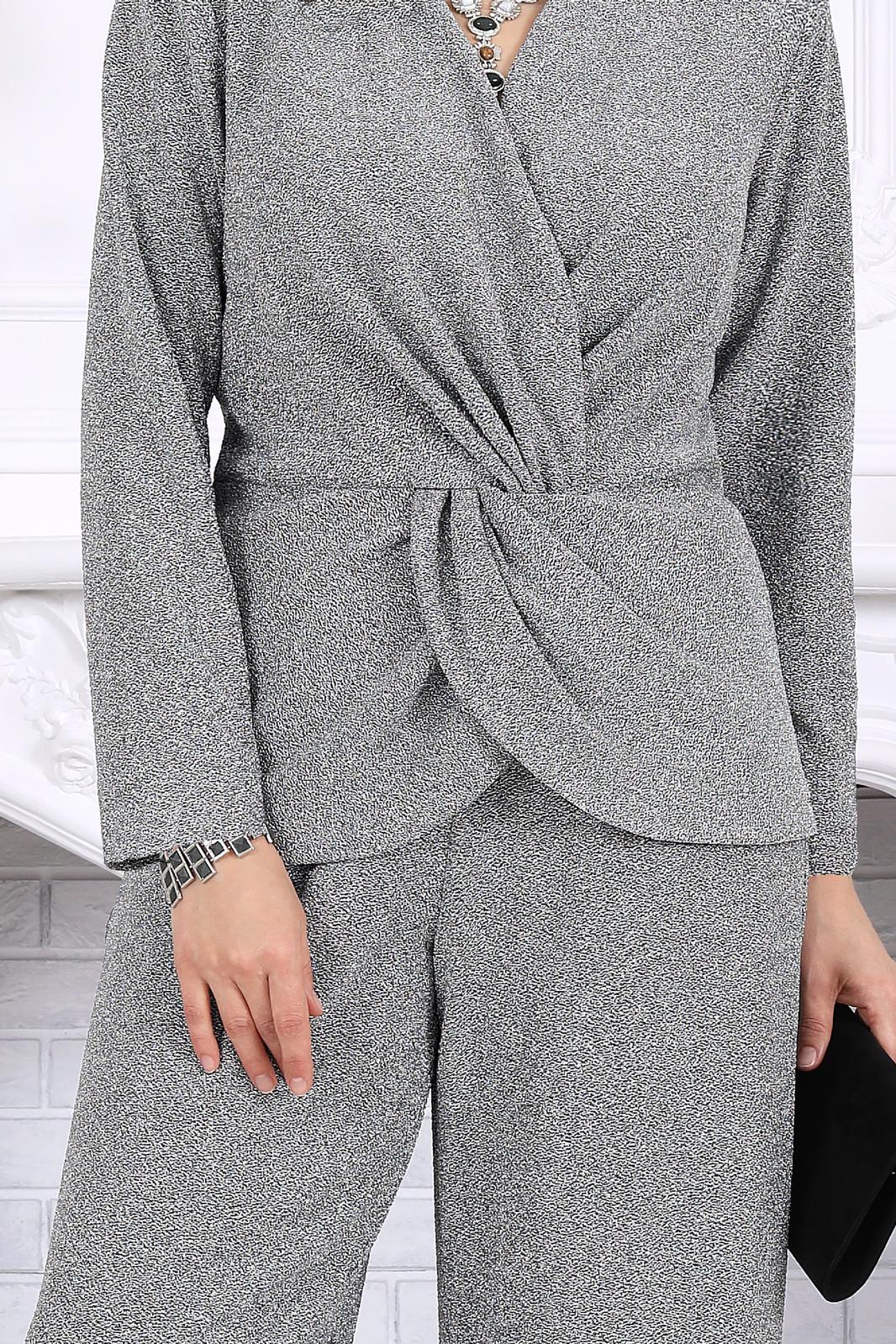 Блузка полуприлегающего силуэта, выполнена из трикотажного полотна с фактурной лицевой стороной «люрекс». Модель на трикотажной подкладке, с длинным втачным рукавом и плечевыми накладками. Спинка с талиевыми вытачками и средним швом. Перед блузы с имитацией «запаха», отрезной по линии талии, по центру декорирован драпировкой «перекрут». Внизу полочки округлой формы. Горловина округлая по спине, V – образная спереди. Длина блузки – 64 см (50-58 р-р); длина рукава – 59 см (50-58 р-р)