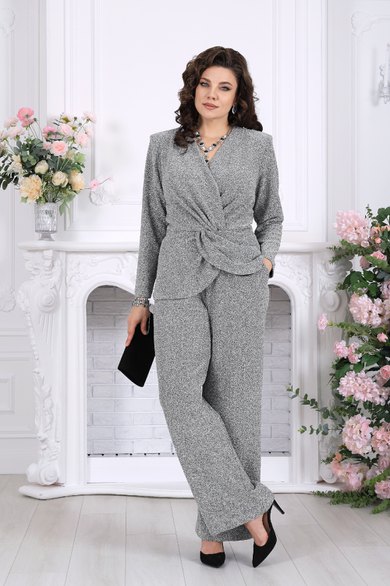 Этот костюм словно создан для моментов, когда хочется выглядеть особенно — уверенно, элегантно и чуть сияюще. Лаконичный силуэт, мягкий блеск люрекса и продуманная посадка делают образ выразительным без перегрузки.
