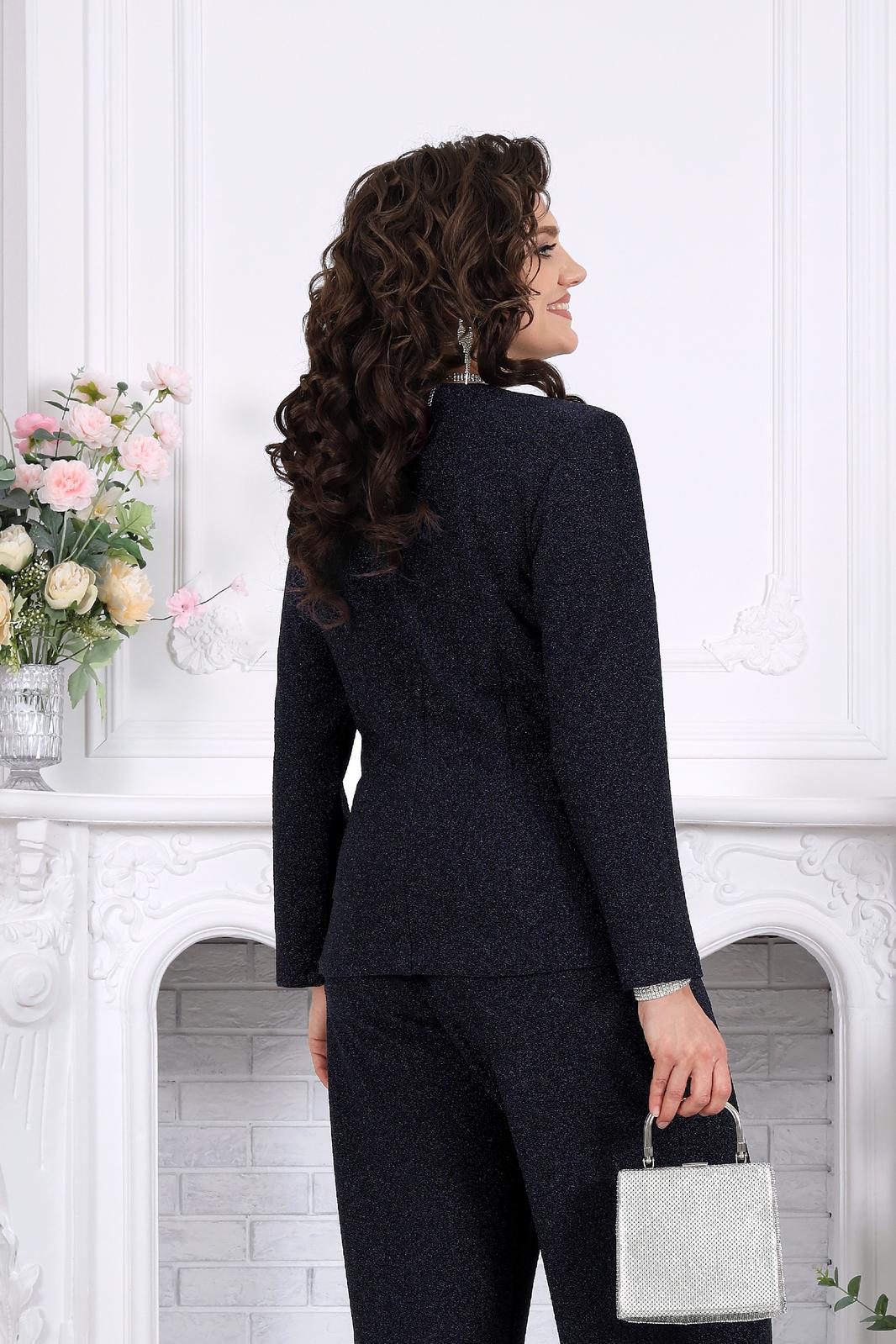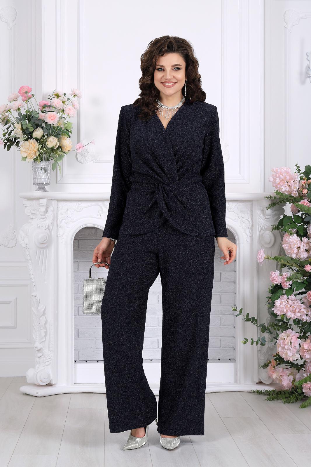 Этот костюм словно создан для моментов, когда хочется выглядеть особенно — уверенно, элегантно и чуть сияюще. Лаконичный силуэт, мягкий блеск люрекса и продуманная посадка делают образ выразительным без перегрузки.