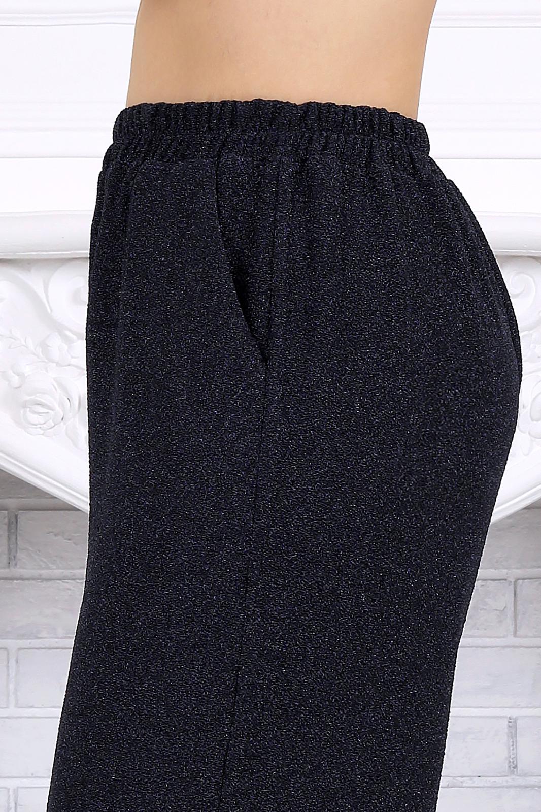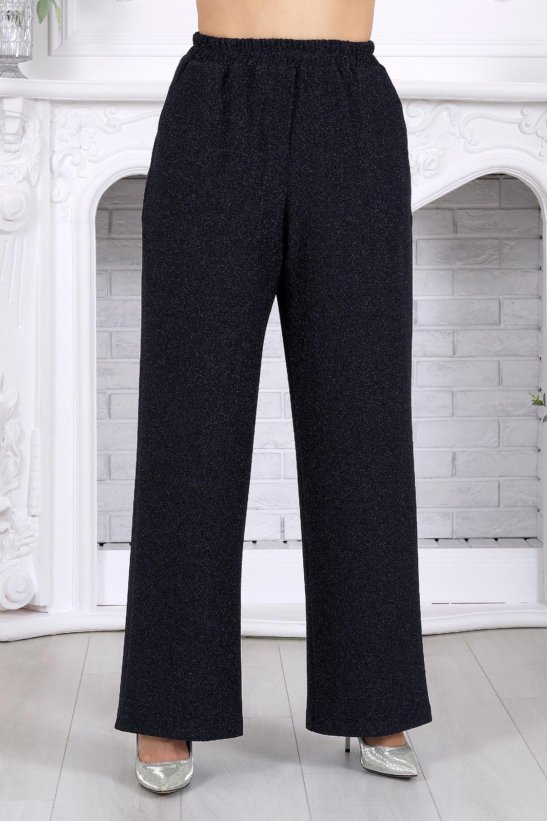 Брюки длинные, с посадкой на талии, выполнены из трикотажного полотна с фактурной лицевой стороной «люрекс». Модель без стрелок, без застежки. Спереди обработаны наклонные боковые карманы. Для лучшего прилегания по линии талии в притачном поясе предусмотрена широкая эластичная лента, вставленная по всей длине. Длина брюк по боковому (с поясом) –107 см (50-52 р-р), 108 см (54-58 р-р).