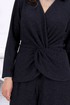 Блузка полуприлегающего силуэта, выполнена из трикотажного полотна с фактурной лицевой стороной «люрекс». Модель на трикотажной подкладке, с длинным втачным рукавом и плечевыми накладками. Спинка с талиевыми вытачками и средним швом. Перед блузы с имитацией «запаха», отрезной по линии талии, по центру декорирован драпировкой «перекрут». Внизу полочки округлой формы. Горловина округлая по спине, V – образная спереди. Длина блузки – 64 см (50-58 р-р); длина рукава – 59 см (50-58 р-р)