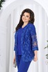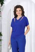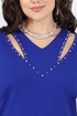Блузка полуприлегающего силуэта, выполнена из трикотажного полотна «масло». Модель без плечевых накладок. Перед с V- образным вырезом по горловине, который оформлен пришивными бусинами. По спинке обработаны талиевые вытачки. Рукав короткий, втачной. Длина блузки- р.50-58 -59 см; длина рукава р.50-52 -30 см; р.54-58 -31,5 см.