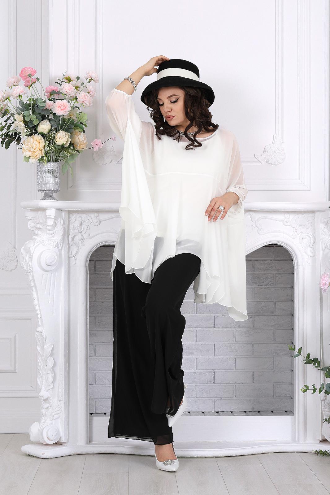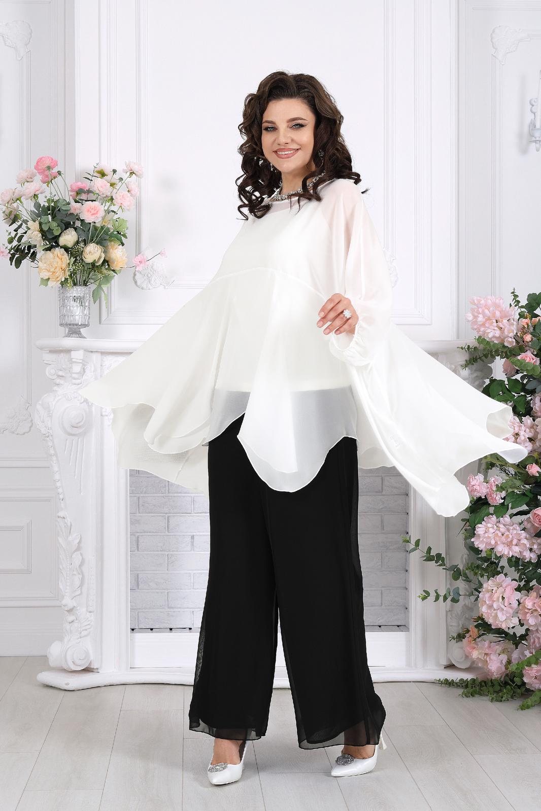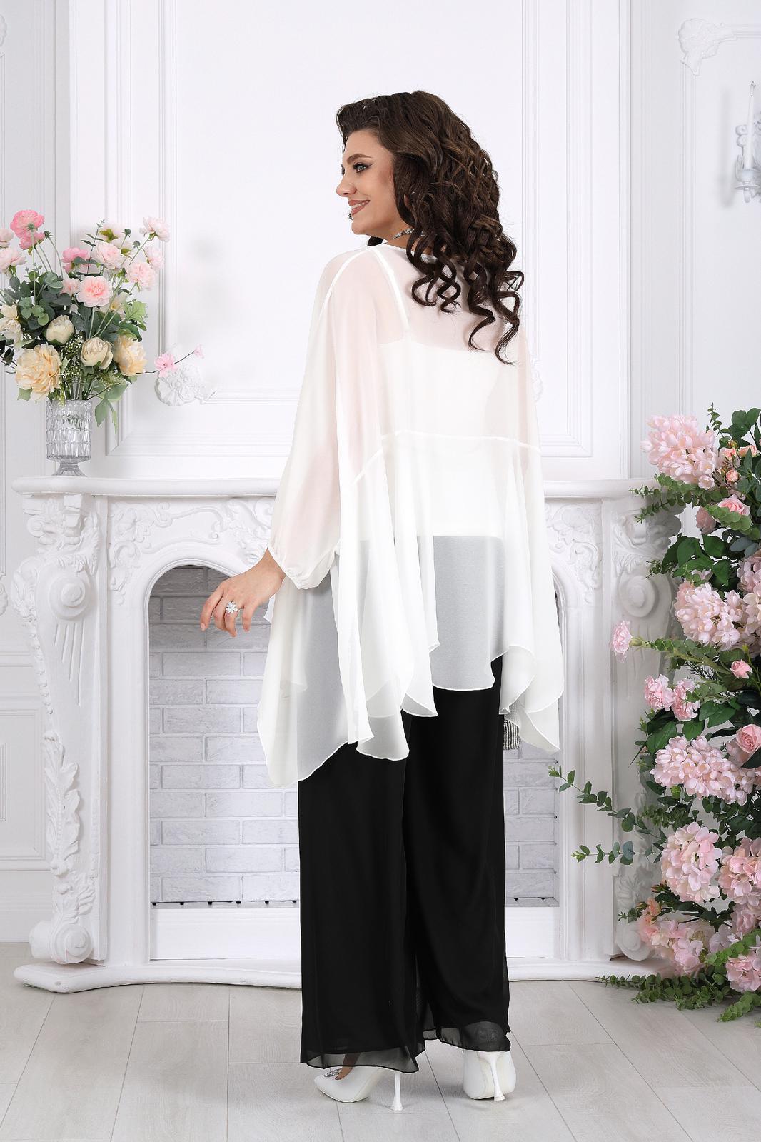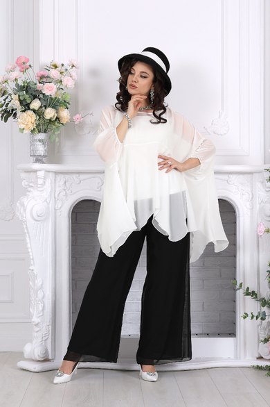 Полупрозрачная туника словно окутывает силуэт легкой вуалью, добавляя образу загадочности и утонченности. Внутренний топ формирует аккуратную основу, а струящиеся брюки завершают ансамбль, создавая вытянутый, элегантный силуэт.
