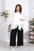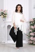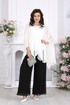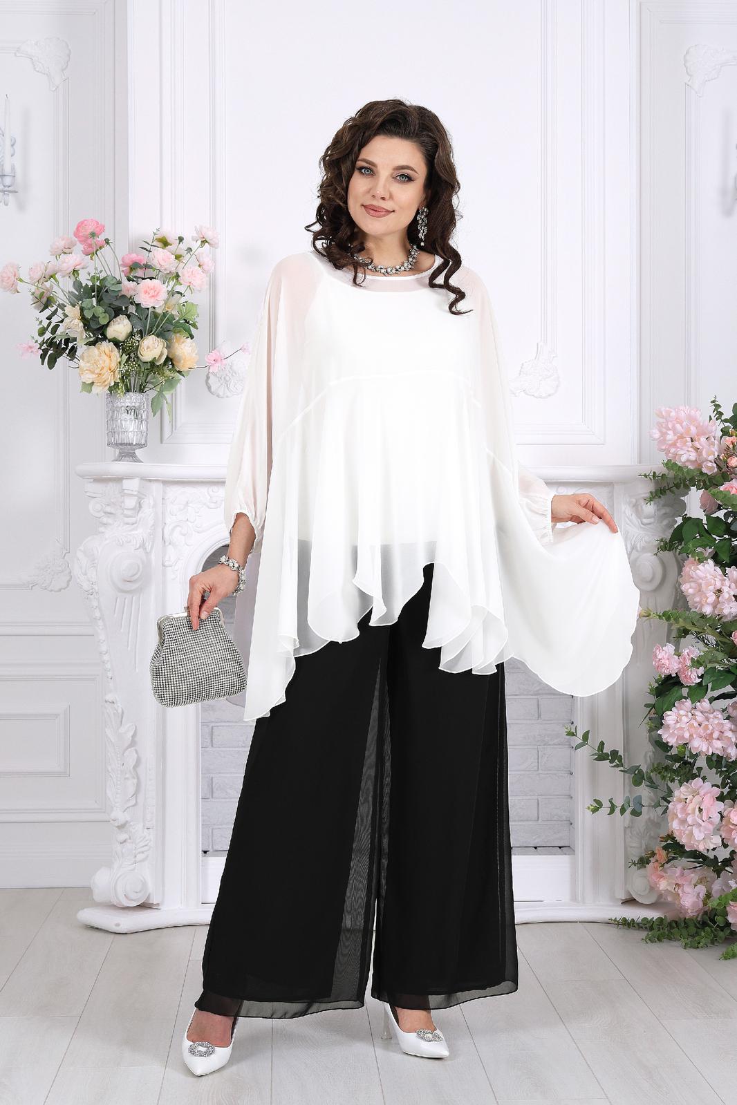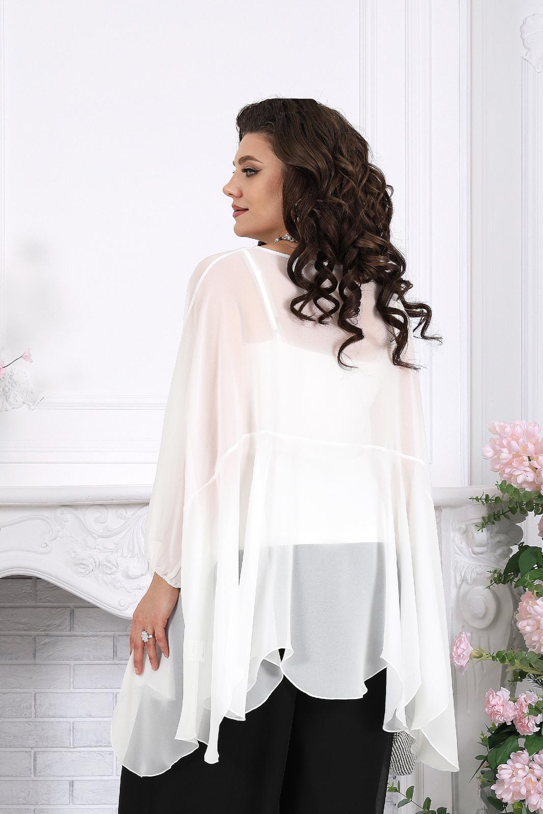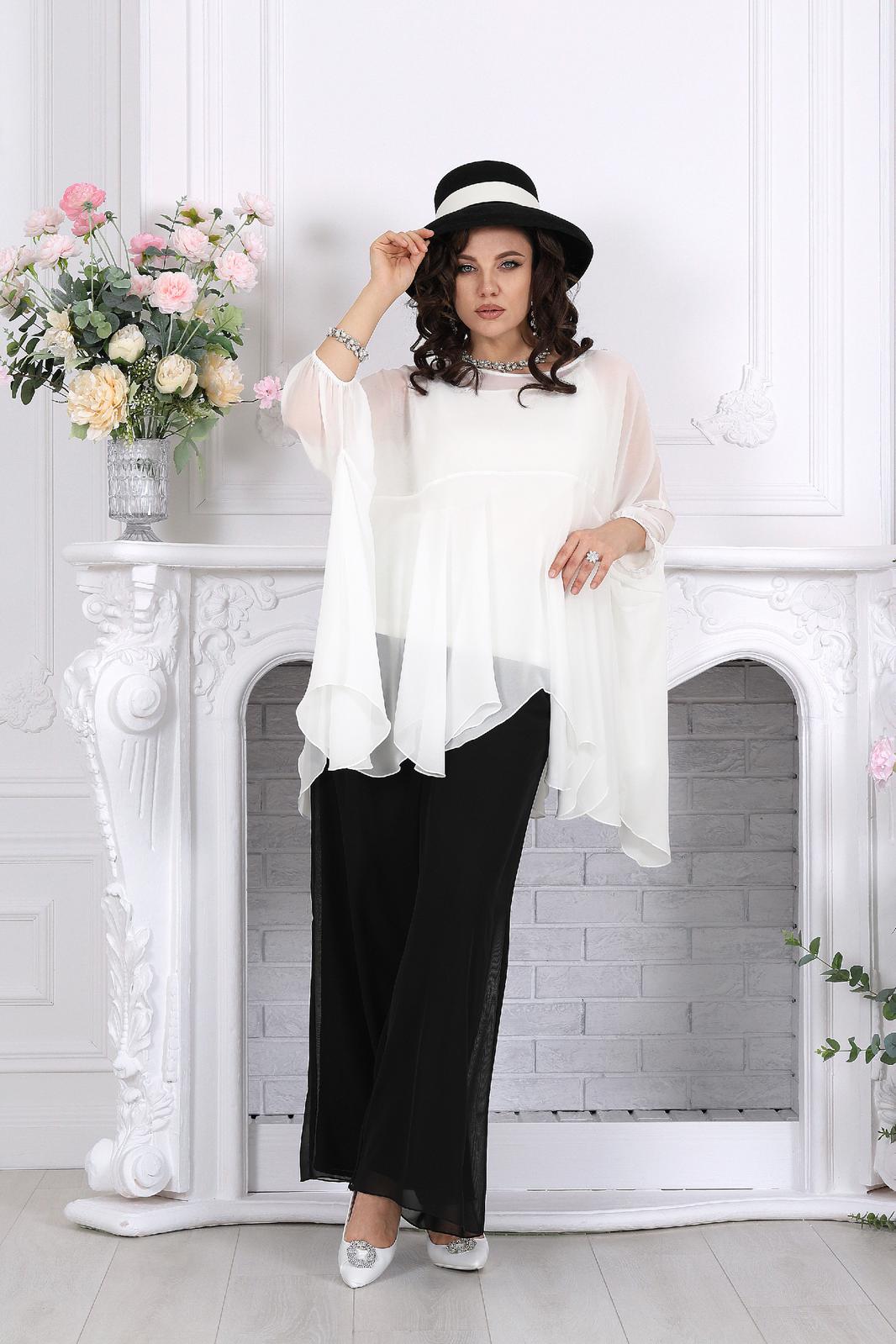 Полупрозрачная туника словно окутывает силуэт легкой вуалью, добавляя образу загадочности и утонченности. Внутренний топ формирует аккуратную основу, а струящиеся брюки завершают ансамбль, создавая вытянутый, элегантный силуэт.