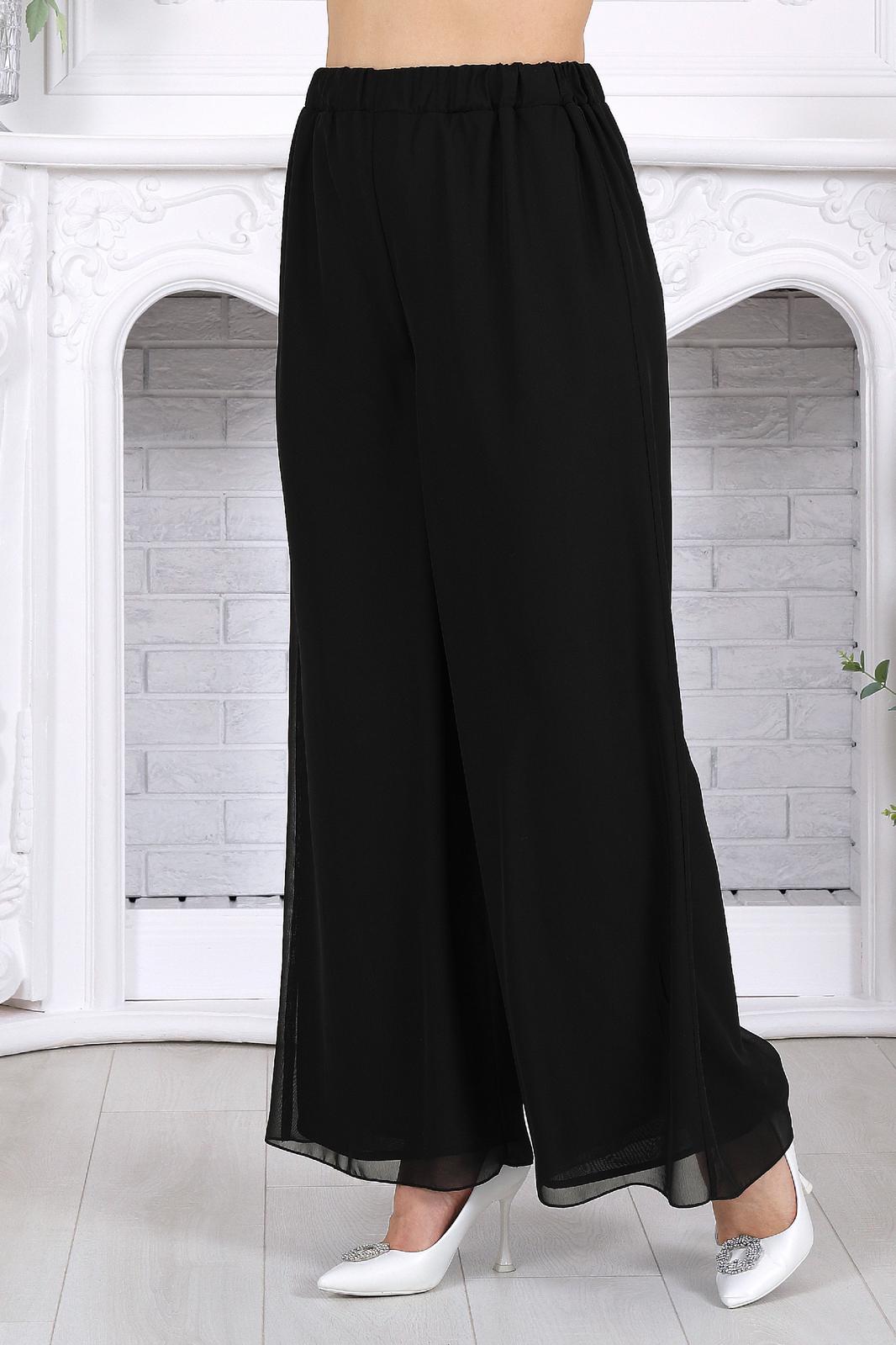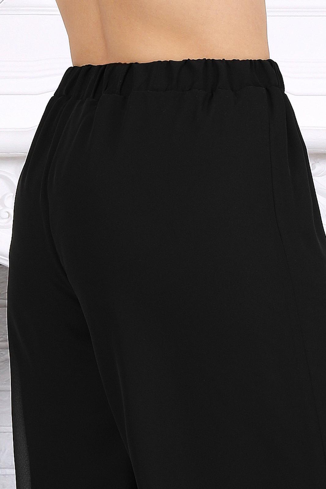 Брюки широкие выполнены из ткани шифон на трикотажной подкладке по всей длине. Модель без стрелок и без застежки. Спереди обработаны наклонные боковые карманы. Для лучшего прилегания по линии талии в притачном поясе предусмотрена эластичная лента, вставленная по всей длине пояса.