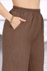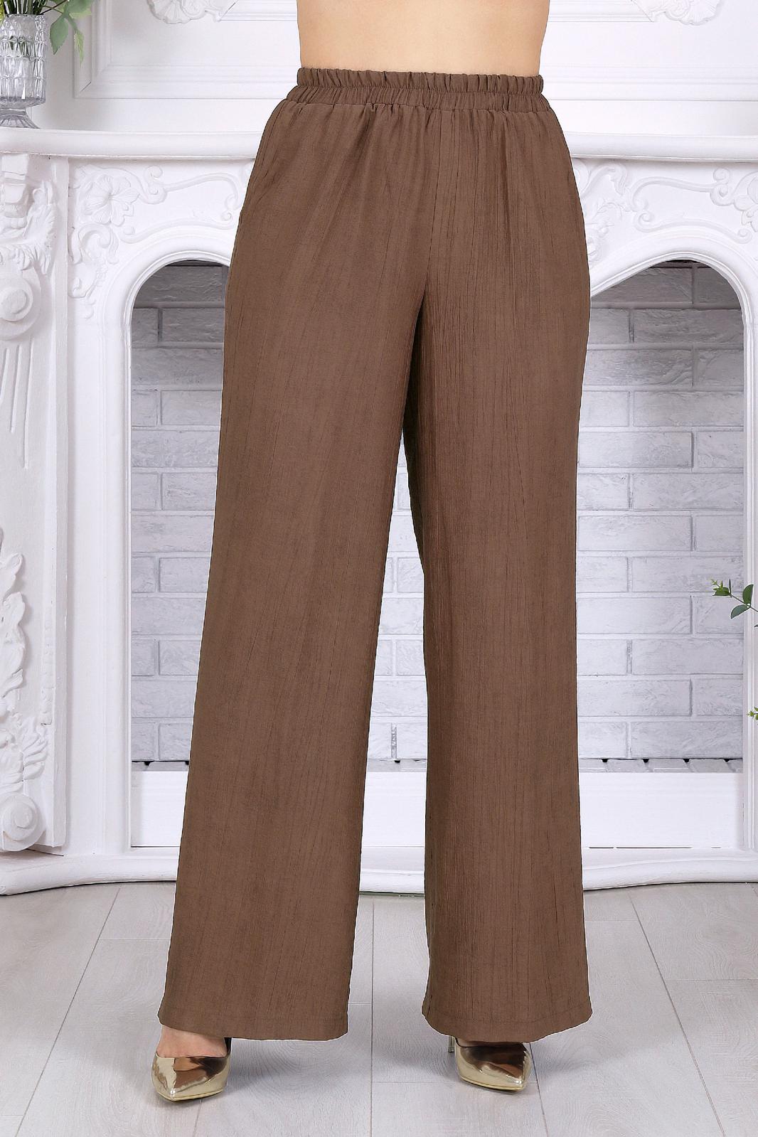 Брюки длинные, прямого силуэта, с посадкой на талии, выполнены из вискозного полотна. Модель без стрелок, без застежки, с наклонными боковыми карманами, на притачном поясе с эластичной лентой внутри. Спереди обработаны наклонные боковые карманы. Длина брюк по боковому (с поясом) – 106 см (50-52 р-р), 107 см (54-58 р-р).