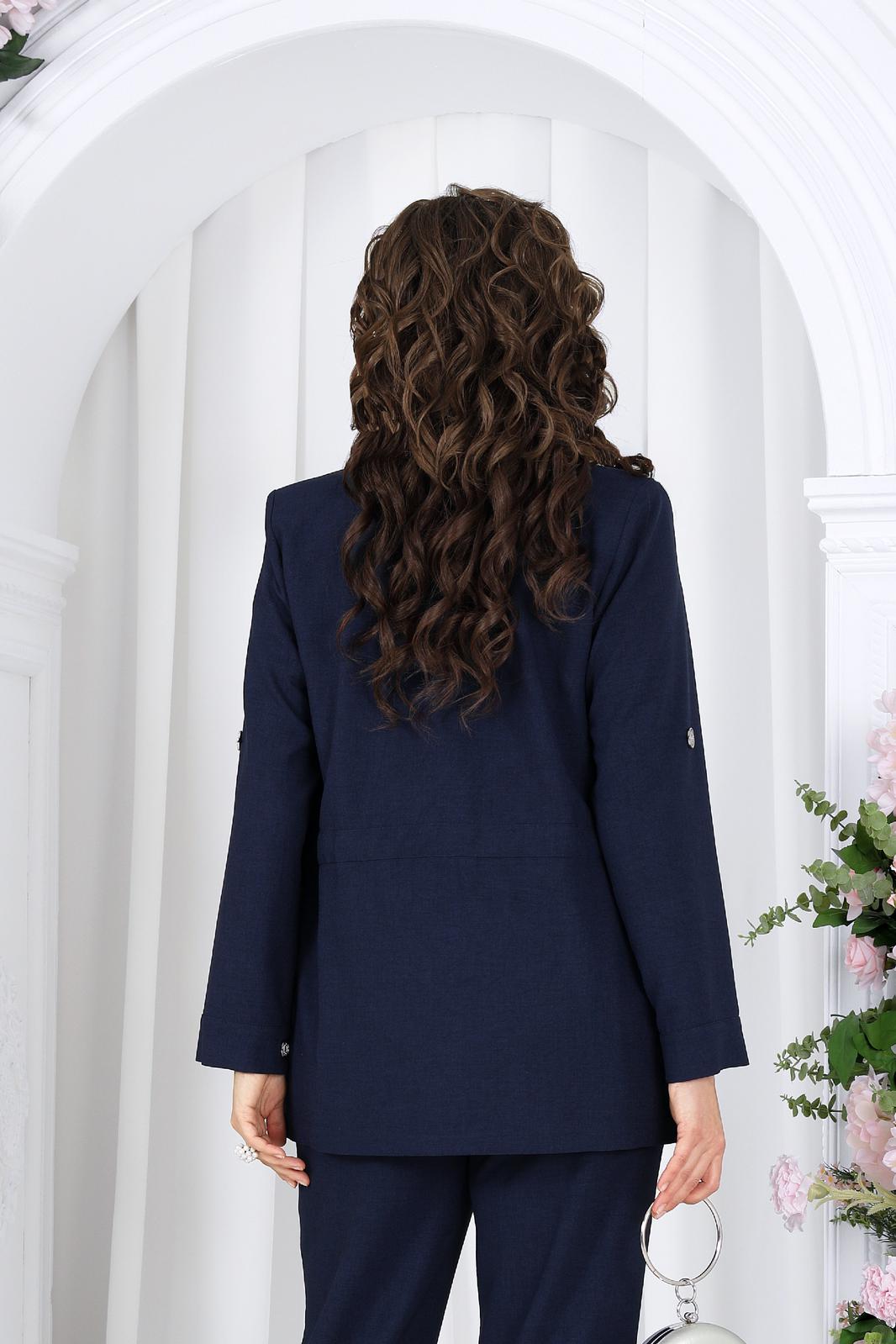 Жакет прямого силуэта, выполнен из ткани «лен-вишер». Модель без подкладки, с плечевыми накладками и однобортной внешней застежкой с отрезными планками на 7 петель и 7 пуговиц. Перед с нагрудными вытачками, выходящими из пройм. В нижней части переда настрочены накладные карманы с бантовой складкой посередине кармана и клапаны, застегивающиеся на 1 петлю и 1 пуговицу. По спинке и частично по переду настрочена кулиса, в которую втянут поясок из основной ткани. Для регулировки сборки по кулисе предусмотрены фиксаторы, концы пояса оформлены наконечниками. Горловина округлой формы со стояче-отложным воротником на отрезной стойке. Рукав втачной, длинный, с притачной манжетой, застегивающейся на 1 петлю и 1 пуговицу; по середине рукава настрочена пата, застегивающаяся на 1 петлю и 1 пуговицу, что позволяет регулировать длину рукава. Длина жакета - 71 см (46-50 р-р), 72 см (52-60 р-р), 73 см (62-66 р-р). Длина рукава (с манжетой) - 61 см.