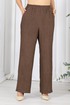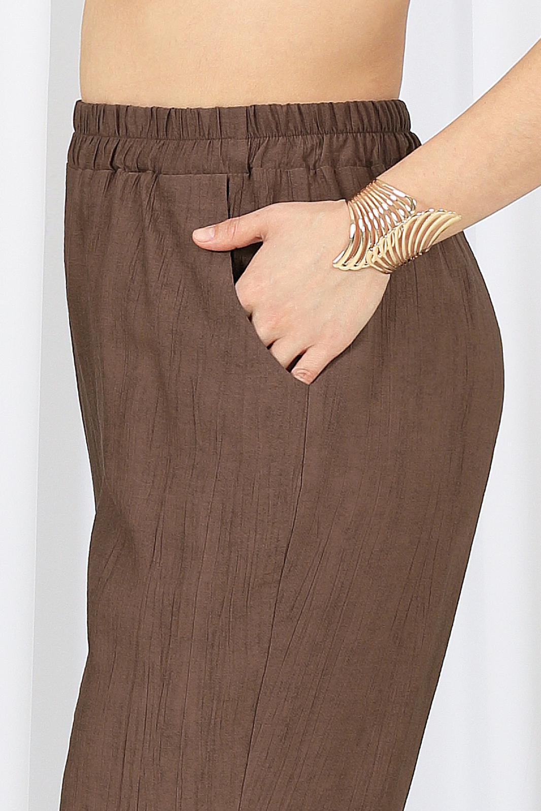 Брюки классические, длинные, с посадкой на талии, выполнены из вискозного крэш-полотна. Модель без стрелок, без застежки. Спереди обработаны наклонные боковые карманы. Для лучшего прилегания по линии талии в притачном поясе предусмотрена эластичная лента, вставленная по всей длине. Длина брюк по боковому (с поясом) – 108 см (50-52 р-р), 109 см (54-58 р-р).