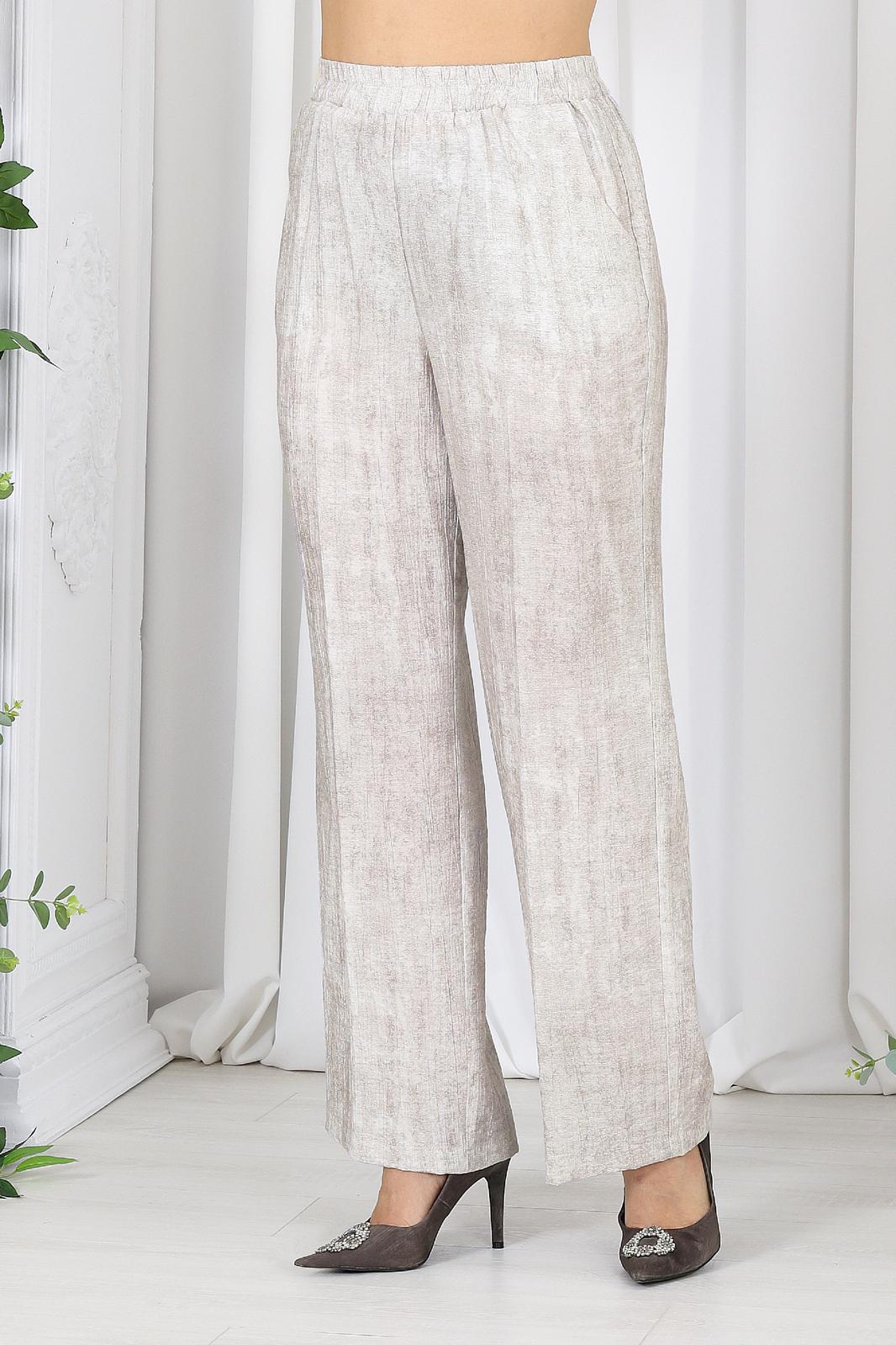 Брюки классические, длинные, с посадкой на талии, выполнены из вискозного крэш-полотна. Модель без стрелок, без застежки. Спереди обработаны наклонные боковые карманы. Для лучшего прилегания по линии талии в притачном поясе предусмотрена эластичная лента, вставленная по всей длине. Длина брюк по боковому (с поясом) – 108 см (50-52 р-р), 109 см (54-58 р-р).