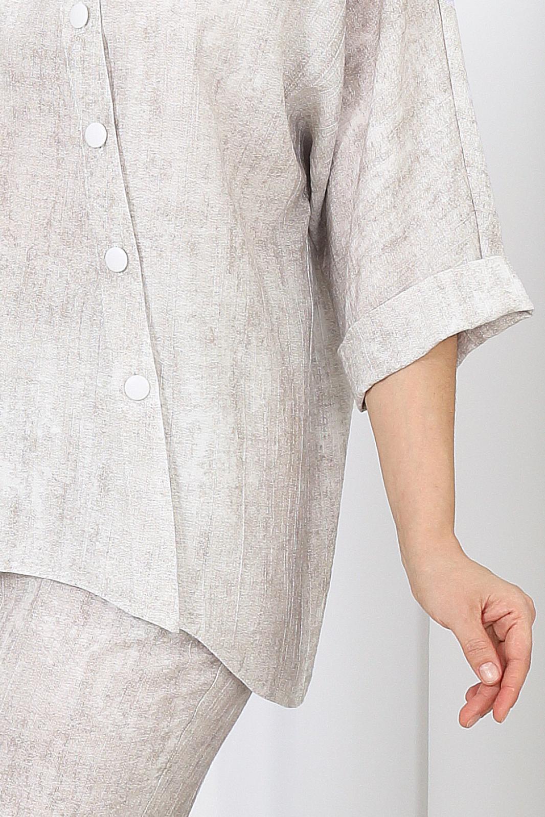 Блузка прямого силуэта, выполнена из вискозного крэш-полотна. Модель с цельнокроеным рукавом и асимметричным низом. Перед со смещенной застежкой на 6 петель и 6 пуговиц; в нижней части, справа, обработан накладной закругленный карман. На кокетке спинки V-образный вырез горловины; края выреза фиксируются по горловине при помощи завязок. Горловина оформлена отложным воротником, разъемным по спинке. Рукав цельнокроеный, длиной ¾, с отложной манжетой по низу. Длина блузки – 74 см (50-58 р-р); длина рукава (от горловины) – 54 см (50-52 р-р), 55 см (54-58 р-р).