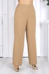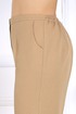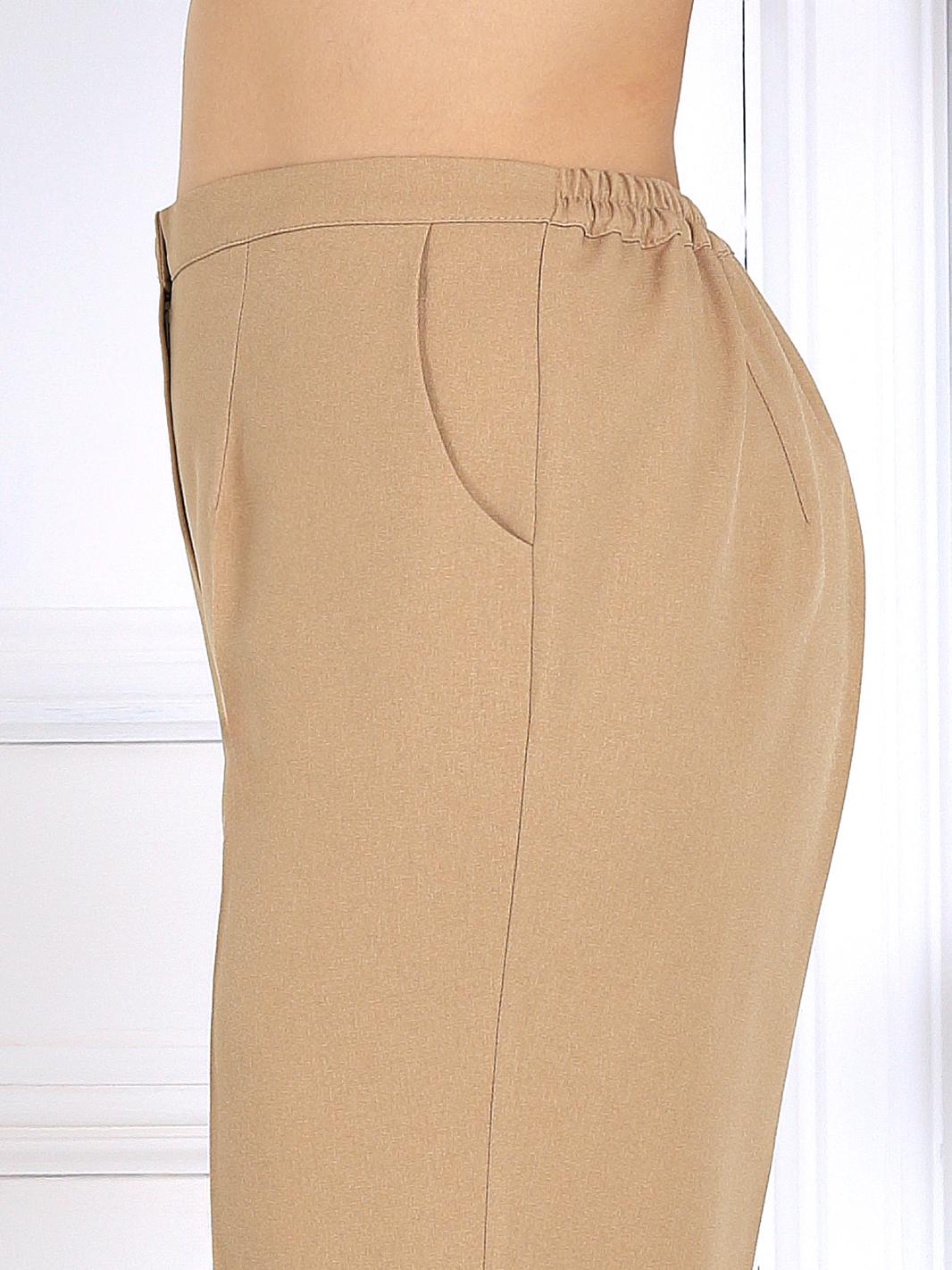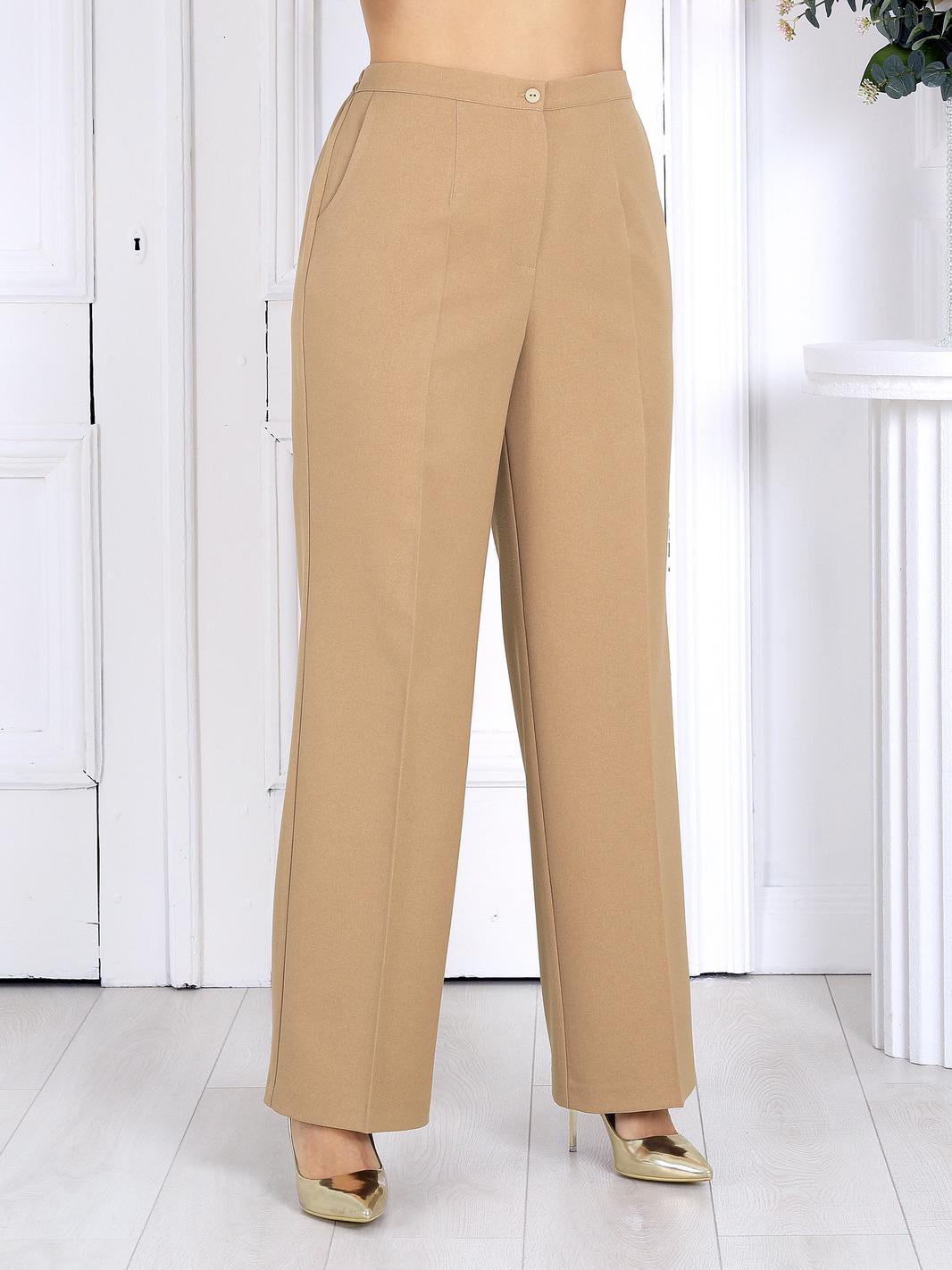 Брюки классические, с кантами и посадкой на талии, выполнены из костюмной поливискозы. Модель с центральной застёжкой на тесьму-«молнию», на притачном поясе, застегивающемся на петлю и пуговицу. Передние и задние половинки брюк с талиевыми вытачками, направленными от пояса вниз. Спереди обработаны боковые наклонные карманы. Для лучшего прилегания брюк в области талии в поясе по задним половинкам вставлена эластичная лента. Длина брюк по боковому (с поясом)-107.
