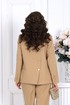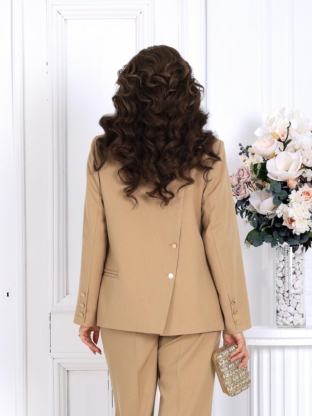Жакет двубортный, полуприлегающего силуэта, выполнен из костюмной поливискозы. Модель на подкладке, с плечевыми накладками. Спереди обработаны рельефные швы, направленные от пройм до низа; в нижней части переда расположены прорезные карманы с клапаном. Перед со смещенной внешней застежкой на 2 декоративные пуговицы и внутренней на 2 потайные. Спинка асимметричная, с одним косым рельефным швом, направленным от правого плечевого до низа; в шве обработана высокая шлица с застежкой на 2 декоративные пуговицы. На нижней части спинки, слева – имитация прорезного кармана «в рамку». Воротник пиджачного типа. Рукав длинный, втачной; в нижней части локтевого шва – имитация шлицы с застежкой на 3 пуговицы. Длина жакета - 66 см; длина рукава - 61 см.