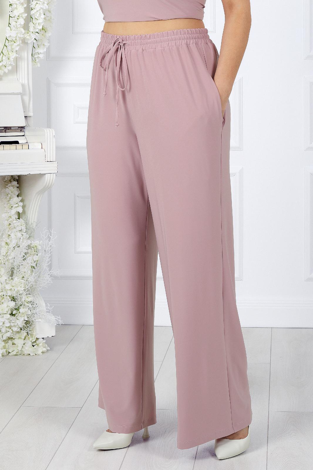 Брюки с посадкой на талии, расширенные от бедра, на притачном поясе с резинкой вдоль всего пояса. По переду пояса выметаны две петли, через которые втянут шнур для дополнительной регулировки сборки. Вдоль пояса прострочены две отделочные строчки. В боковых швах обработаны карманы.