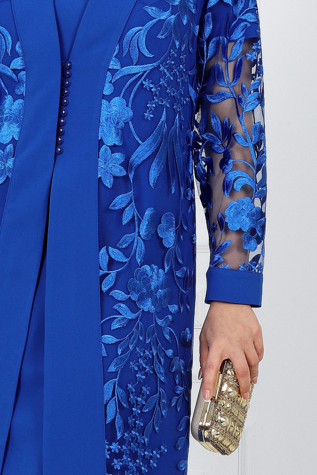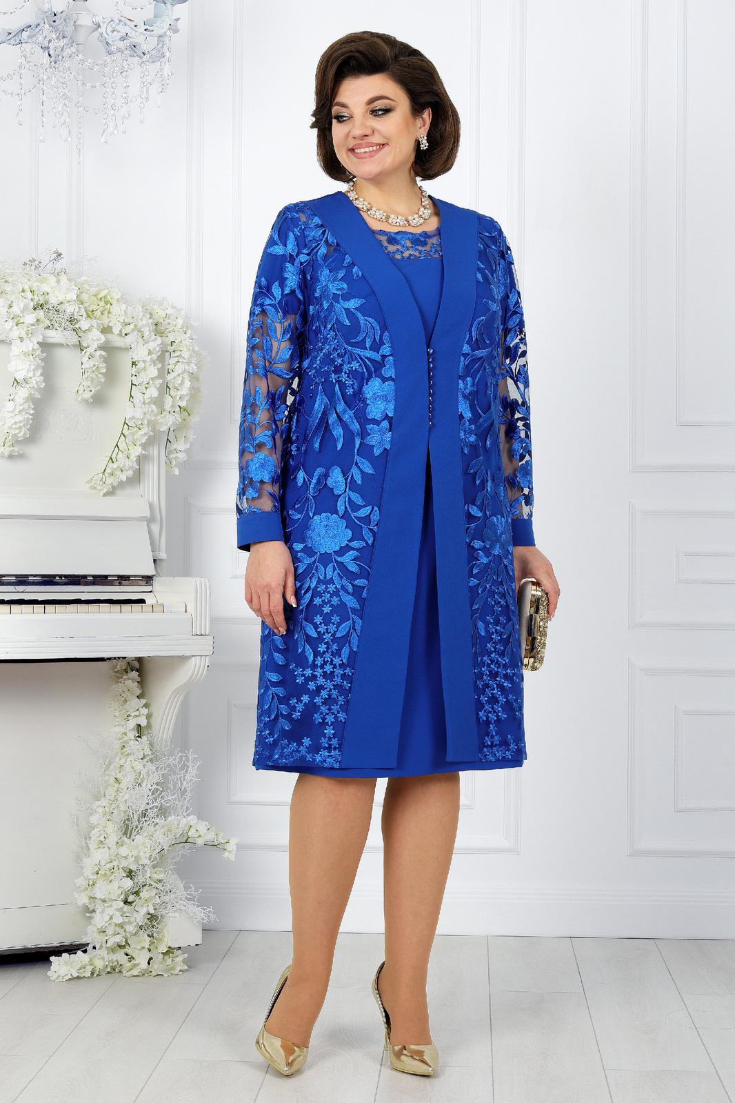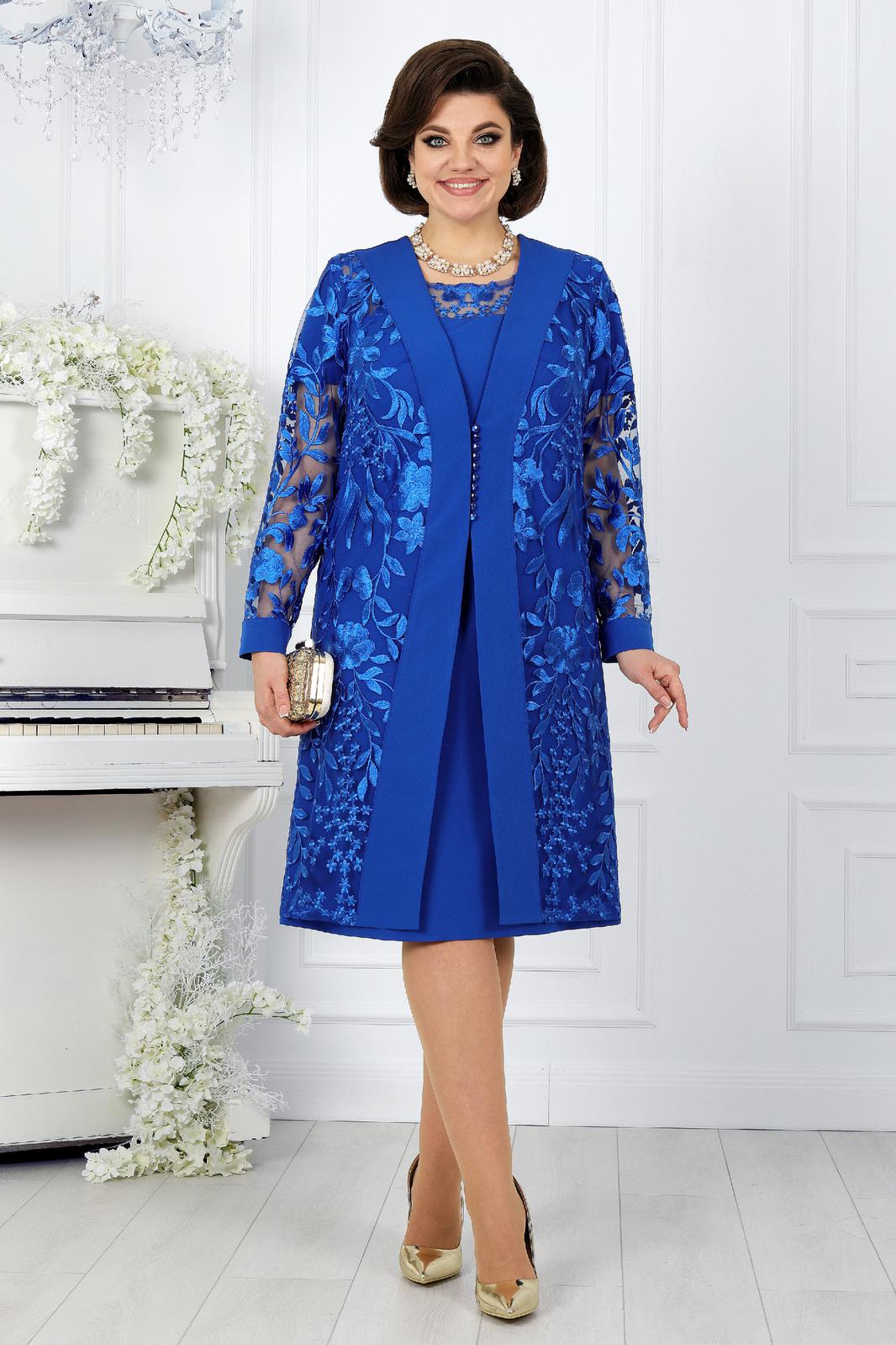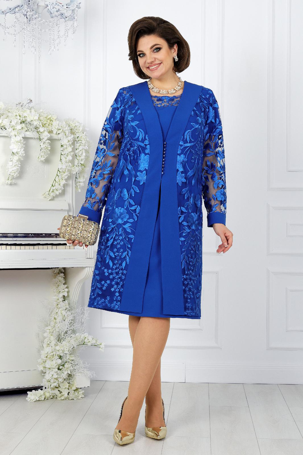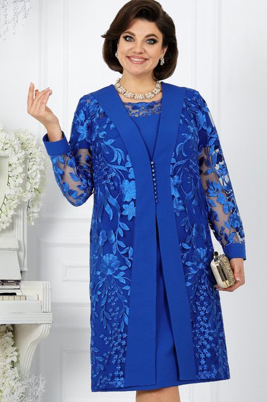 Представляем вашему вниманию вечерний женский костюм от NINELE - истинное воплощение изящества. Этот наряд собрал в себе лучшие модные свадебные тенденции: сочетание костюмной ткани с изысканным кружевом придает образу особую изысканность и стиль. Костюм идеально подойдет для свадебного торжества, вечернего мероприятия или другого особого случая, где вы захотите выглядеть неповторимо и элегантно. Особенностью данного костюма является кружевной кардиган, выполненный из кружева и основной ткани. Такой дизайн элегантно формирует правильный силуэт фигуры, подчеркивая ее достоинства. Комплект женский, 2-х предметный, состоящий из платья и кардигана, выполненных из костюмно-плательной ткани в сочетании с гипюром. Платье женское полуприлегающего силуэта, расширенное к низу, длиной по среднему шву спинки 103 см. Перед с фигурной кокеткой из гипюра, идущей от середины левого плеча и уходящей в правую пройму, с декоративной деталью по правой стороне, идущей от кокетки вниз до линии талии. Длина платья - 103 см. (48-52 р-р.), 104,5 см (54-60 р-р.).Декоративная деталь 2-х слойная: верхний слой из гипюра, нижний из трикотажной подкладки. Перед с нагрудными вытачками, идущими: левая- из проймы, правая от декоративной детали. Спинка с талиевыми вытачками, со средним швом, в верхней части которого обработана застежка на потайную тесьму-«молния». Горловина спинки округлая, обтачная. Горловина переда округлая, углубленная, срез обработан на плоскошовной машине. Рукава втачные, одношовные. Длина рукавов 21 см. Длина кардигана - 105 см. (48-52 р-р.), 106,5 см. (54-60 р-р).