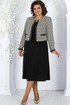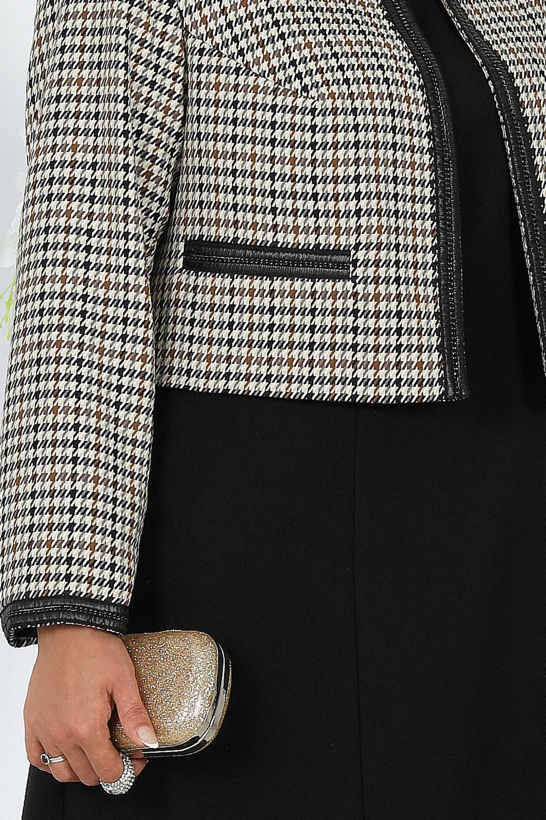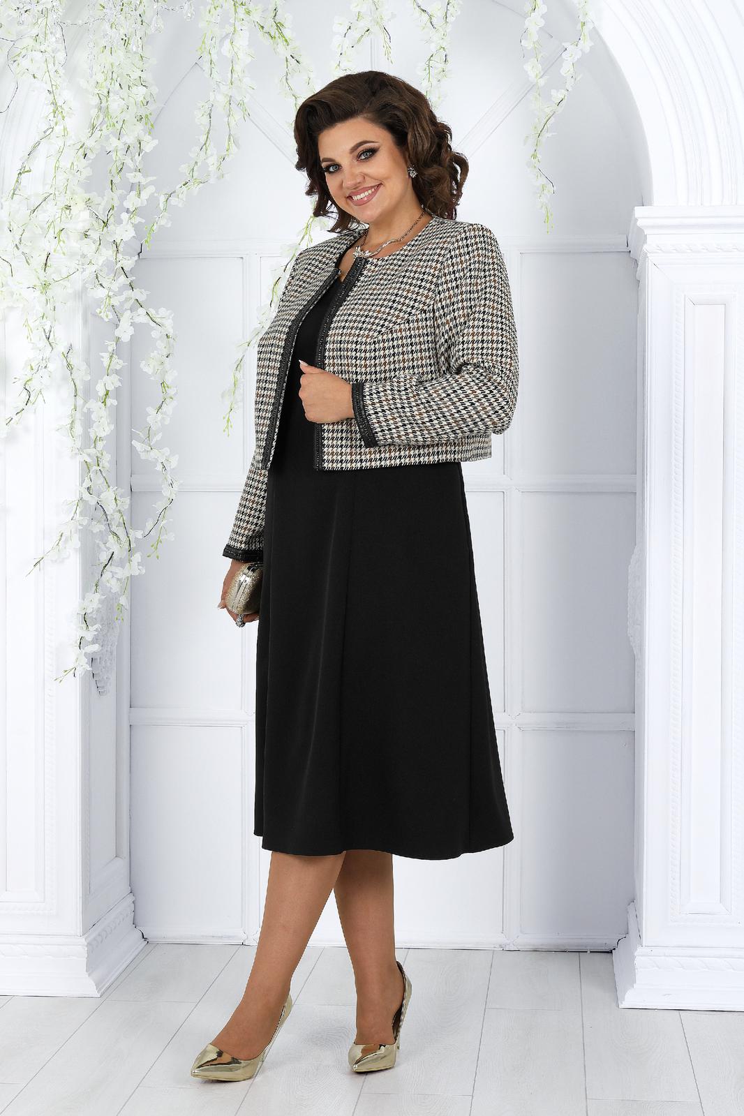 Комплект женский, состоящий из жакета, выполненного из костюмной ткани гусь-лапка, и платья из однотонной плательной ткани.