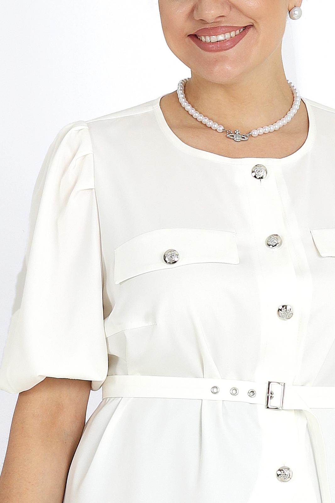 Блузка прямого силуэта, выполнена из платьево-блузочного сатина. Модель без подкладки, без плечевых накладок. Низ блузки асимметричной формы: укороченный по спинке и удлиненный спереди; борта и низ переда оформлены углами и декорированы отделочной строчкой шириной 3,5 см. Перед с нагрудными вытачками, направленными от пройм, и настрочными фигурными клапанами, закрепленными по центру декоративной металлической пуговицей. Спереди обработана центральная застежка на 5 прорезных петель и 5 металлических пуговиц. Горловина округлая, углубленная спереди. Рукав короткий, втачной, с объемным за счет складок окатом и низом, сосборенным эластичной лентой. Модель комплектуется съемным поясом с металлической пряжкой, выполненным из основной ткани; для регулировки пояса по длине предусмотрены металлические блочки, для фиксации свободного края – шлевка. Длина блузки - 63 см; длина рукава – 38 см.