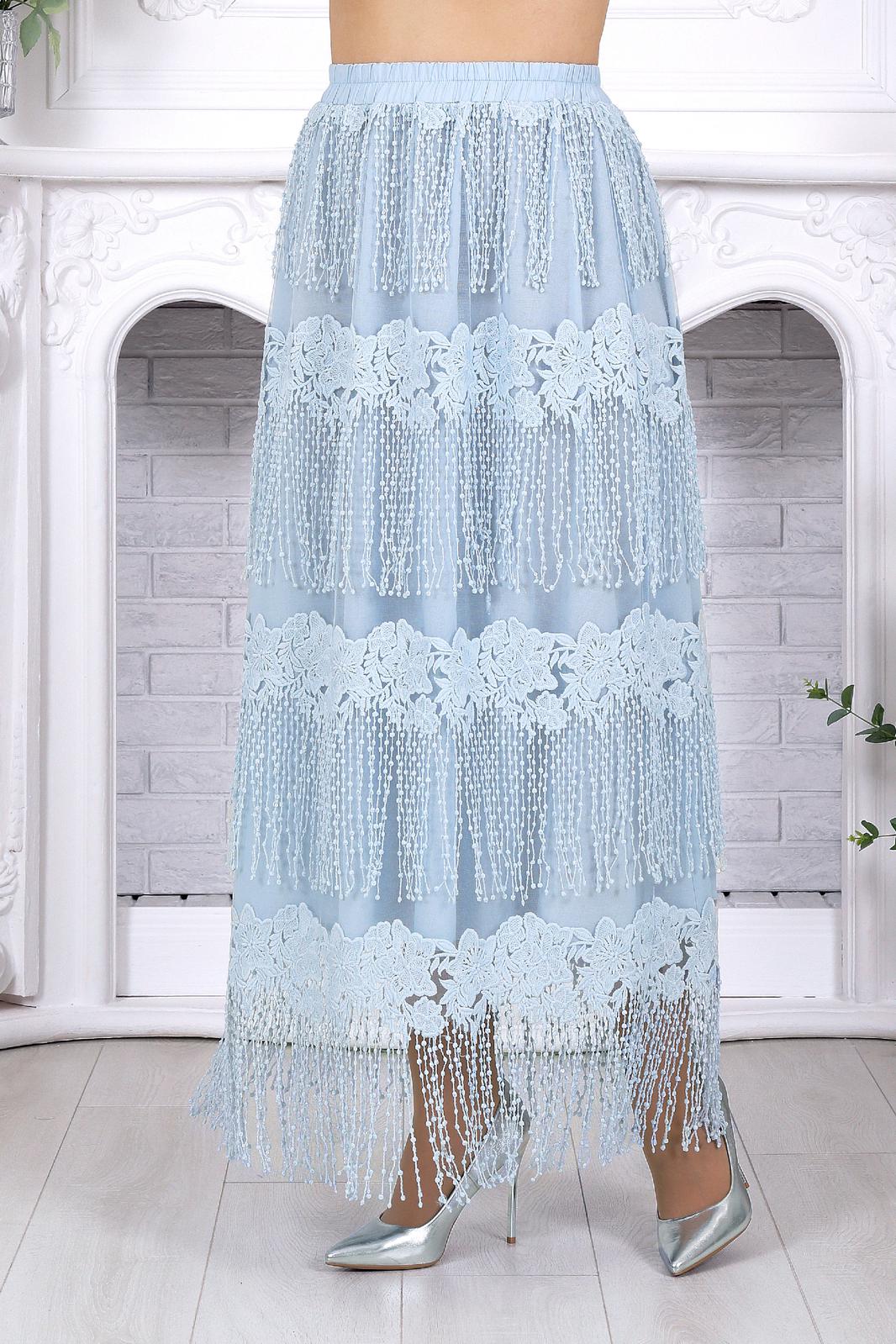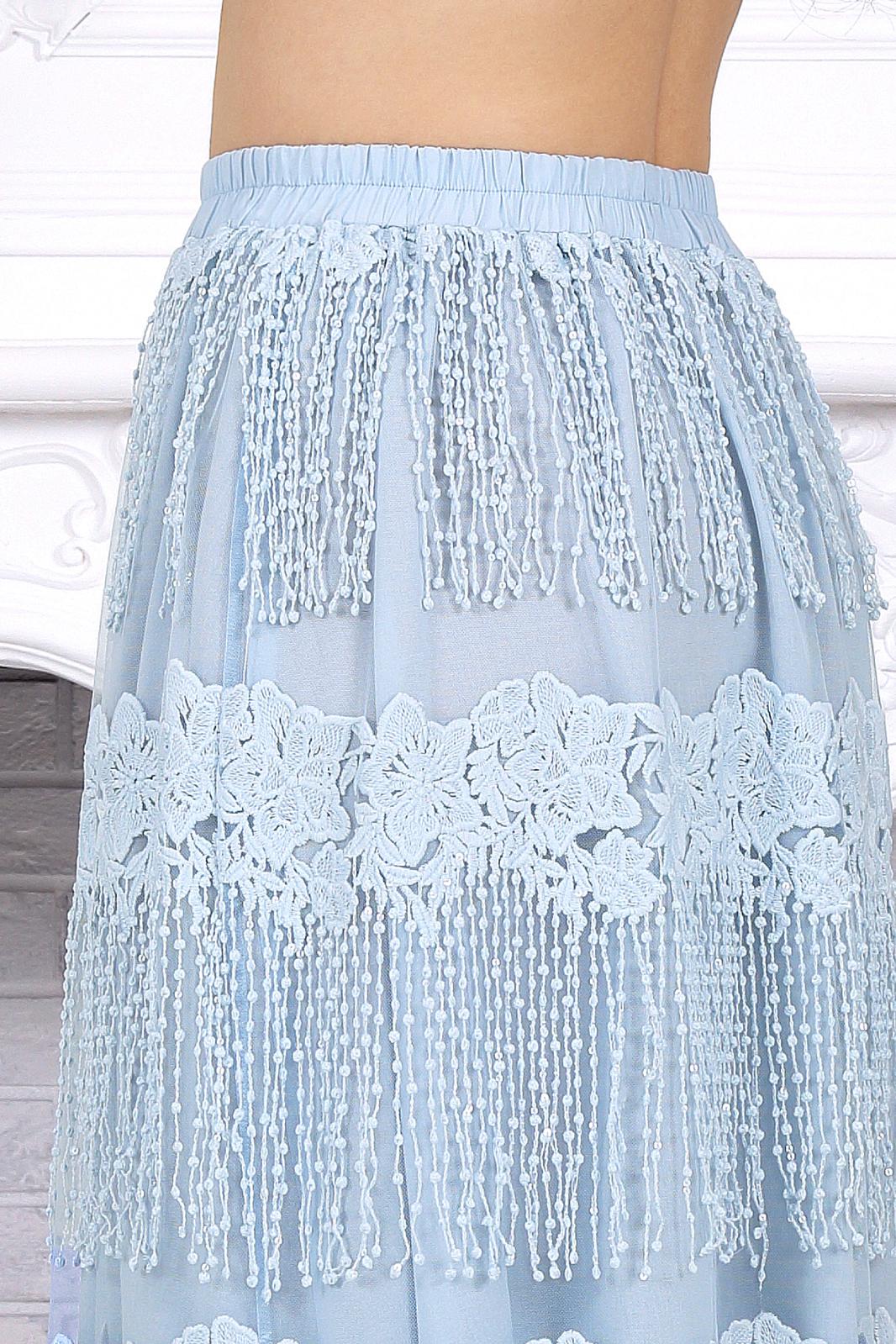 Юбка прямая, расширенная к низу. Модель двухслойная: верхний выполнен из сетки с вышивкой, нижний из хлопчатобумажного подкладочного полотна. Юбка без застежки, на притачном поясе с протянутой внутрь эластичной лентой.