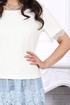 Блузка полуприлегающего силуэта, выполнена из вискозы. Горловина по спинке округлая, по переду округлая углубленная. Рукав короткий, втачной, низ рукава обработан кружевом с фестоном. По переду блузки есть центральный шов и на него настрочено кружево с фестоном. Длина блузки –54 см; длина рукава –27 см.