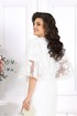 Накидка свободного кроя, выполнена из гипюра. Модель с застежкой спереди на декоративную пуговицу и навесную петлю. Горловина округлой формы, окантована узкой косой бейкой из костюмно-плательной ткани. Длина накидки (по середине спинки) – 46 см.