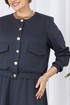 Жакет однобортный, прямого силуэта, выполнен из поливискозного трикотажного полотна. Модель на притачном поясе, без подкладки, с плечевыми накладками. Перед с центральной внешней застежкой на 6 петель и 6 декоративных пуговиц; в верхней части переда обработаны нагрудные вытачки, направленные от пройм, в нижней части настрочены накладные карманы с клапаном. Горловина круглой формы, углубленная спереди. Рукав длинный, втачной, на притачной манжете без застежки. Длина жакета –