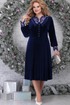 Платье женское, бархатное, полуприлегающего силуэта, отрезное по линии талии, на подкладке из дышащей, приятной на ощупь и достаточно эластичной ткани. Длина по среднему шву спинки 110,0 см. Подрезы лифа входят из боковых швов под линией груди вверх к центру. Деталь со сборкой и кокеткой из гипюра. На среднюю часть нашита планка. Шов притачивания кокетки и планка украшены стеклярусом. Спинка со средним швом и талевым выточками. Юбка, расширенная к низу с частично зашитыми бантовыми складками по переду и спинке. Рукава втачные, одношовные, со сборкой по шву притачивания гипюровой манжеты. Длина рукава 66,0 см. Горловина углублённая спереди, комбинированная, обтачная, спереди под кокеткой с пришитой планкой. В левом боковом шве обработана застёжка на потайную тесьму молнию.