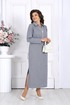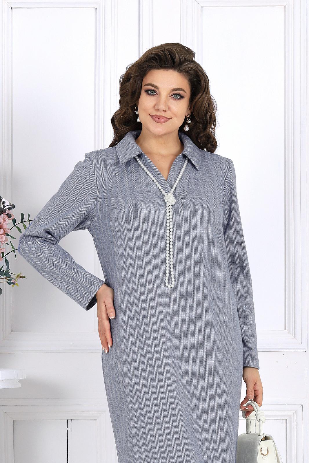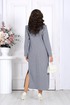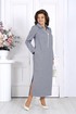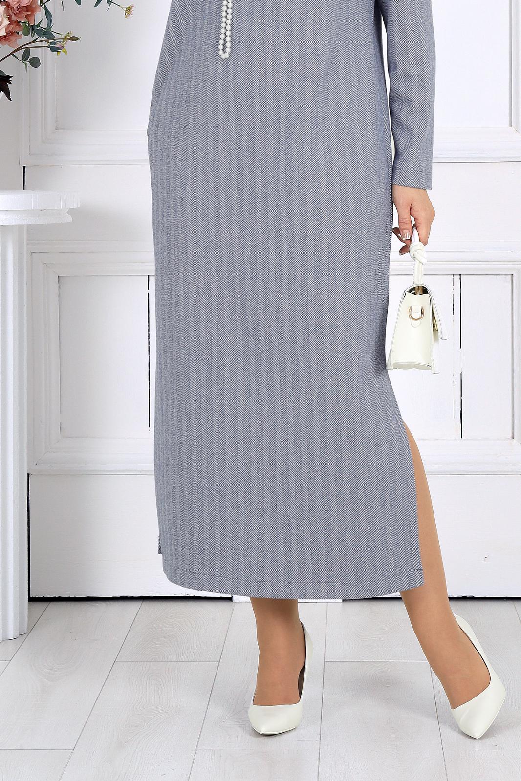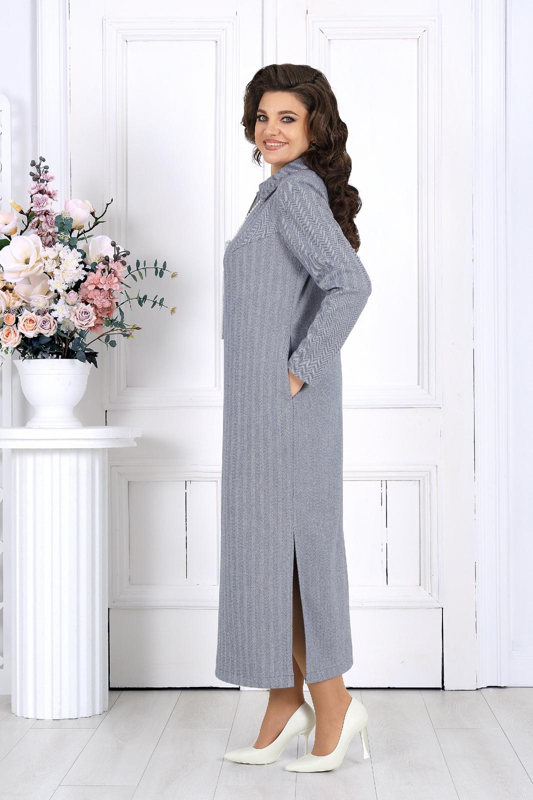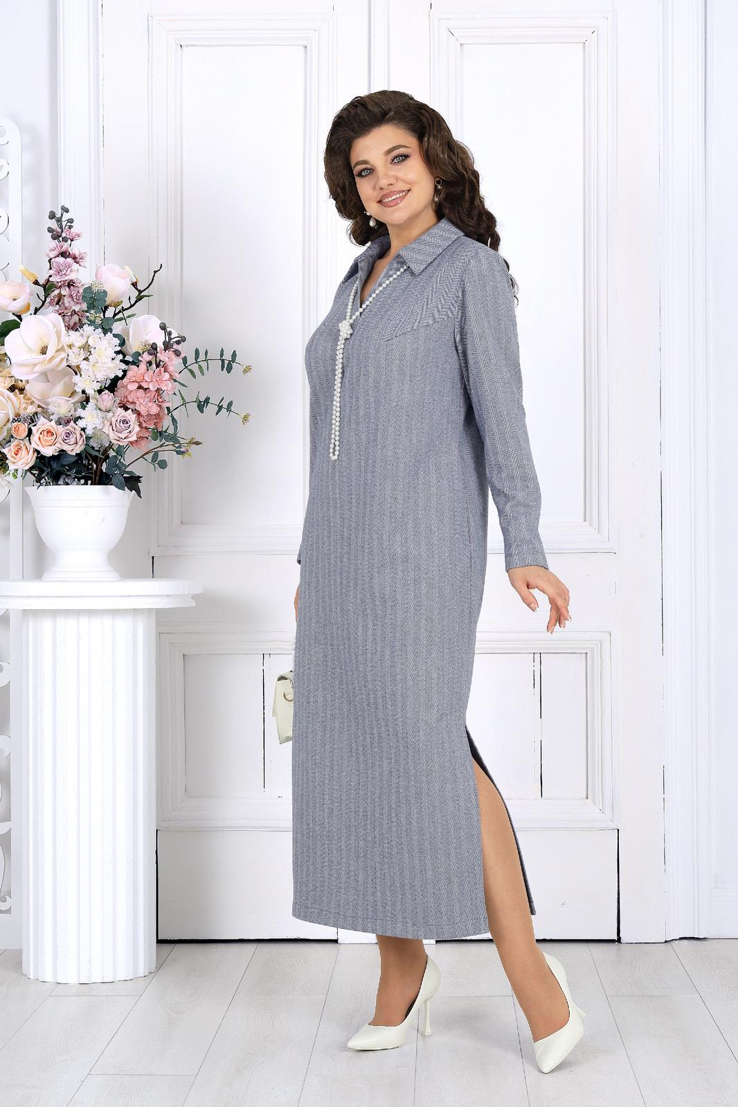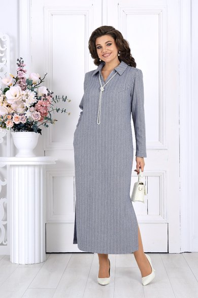 Платье женское, прямого силуэта, расширенное к низу, выполнено из трикотажного полотна. Платье женское прямого силуэта, длиной по среднему шву спинки 124 см, от шва втачивания воротника. Перед платья с нагрудными вытачками из проймы. Спинка со средним швом. В боковых швах обработаны карманы и разрезы. Воротник рубашечного типа, по переду планка «поло». Рукав втачной, одношовный, длиной 60 см. Платье без подкладки.