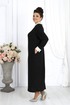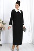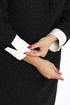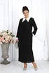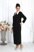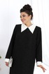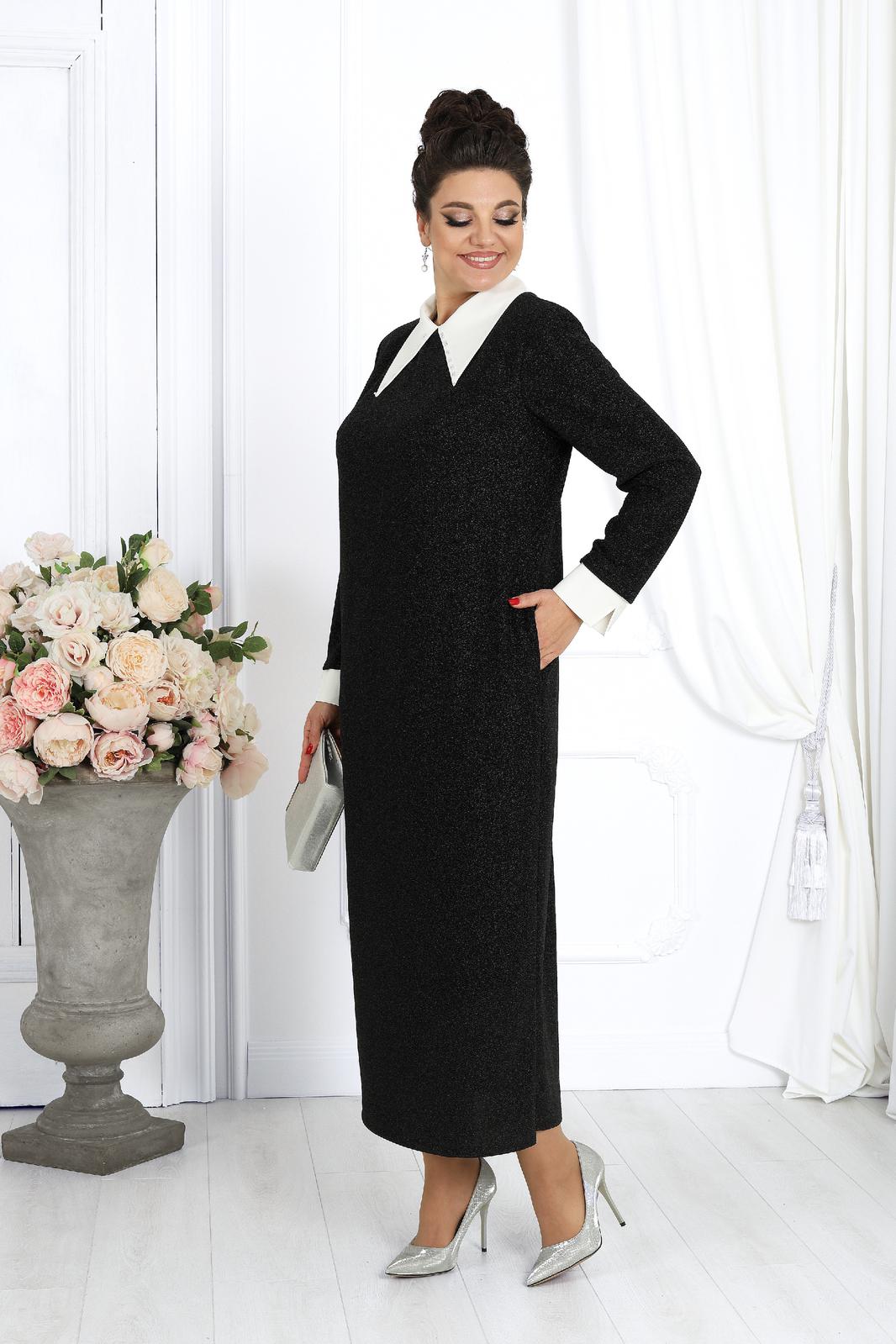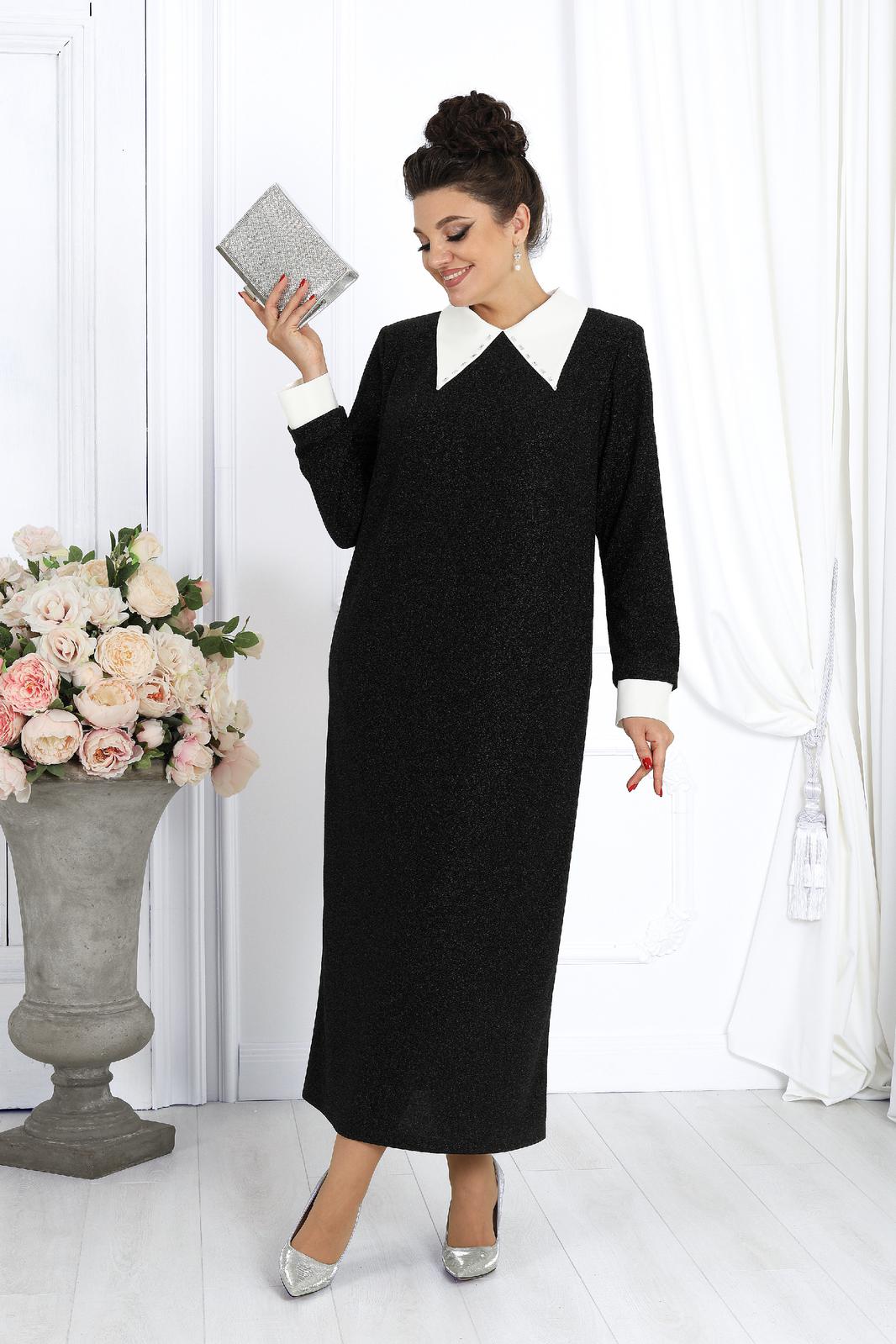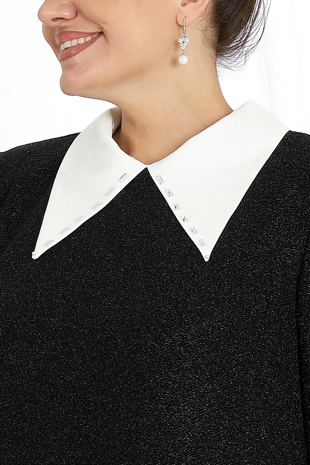 Платье женское полуприлегающего силуэта, выполнено из трикотажного полотна с фактурной лицевой стороной «люрекс». Модель с карманами в боковых швах, на трикотажной подкладке, с плечевыми накладками. Перед с нагрудными вытачками, направленными от пройм. В верхней части среднего шва спинки расположена застежка на тесьму-«молнию» (50 см), в нижней - разрез. Круглая горловина оформлена съемным воротником, декорированным спереди пришивными камнями. Рукав длинный, втачной, низ оформлен съемной манжетой с разрезом. Воротник и манжеты выполнены из сатина и пристегиваются к изделию при помощи прорезных петель и пуговиц.