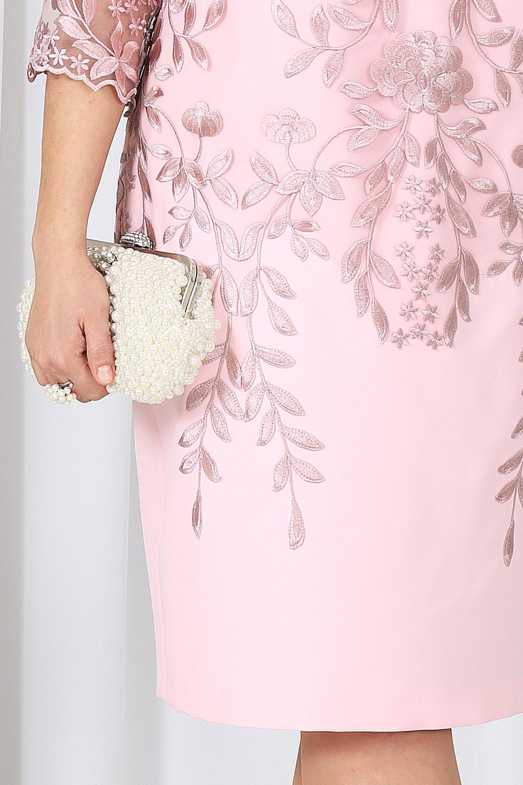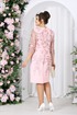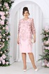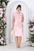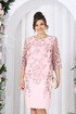 Платье женское полуприлегающего силуэта, зауженное к низу, из костюмно-плательной ткани в сочетании с гипюром. Длина по среднему шву спинки р 50-52 - 101,5 см, р 56-66 – 103,5 см. Перед и спинка двухслойные от плечевого шва до нижней линии бедер, с настрочными декоративными веточками, направленными к низу изделия. Верхний слой выполнен из гипюра. Перед с нагрудными вытачками, идущими из пройм. Спинка, с талиевыми вытачками в нижнем слое, со средним швом, в нижней части которого расположена шлица. В левом боковом шве обработана застёжка на потайную тесьму - молнию. Горловина переда и спинки округлая, по переду углубленная. Рукава втачные, одношовные, выполнены из гипюра. Низ рукавов оформлен фестонами. Длина рукава 44 см. Платье с плечевыми накладками.