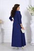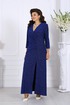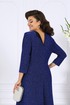 Платье женское, расширенное к низу, выполнено из трикотажного полотна с фактурной лицевой стороной «люрекс». Модель на трикотажной подкладке, с плечевыми накладками. Перед платья асимметричный, состоит из двух деталей, скрепленных на запах. На левой детали переда обработан рельефный шов с разрезом по низу. Правая деталь переда задрапирована сборкой и входит в рельеф на участке между двумя горизонтальными подрезами боковой части переда. На спинке обработаны талиевые вытачки и средний шов с застежкой на потайную тесьму-«молнию» (50 см). Рукав трехчетвертной. Длина платья – 137 см. Длина рукава – 47 см