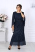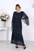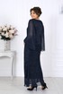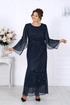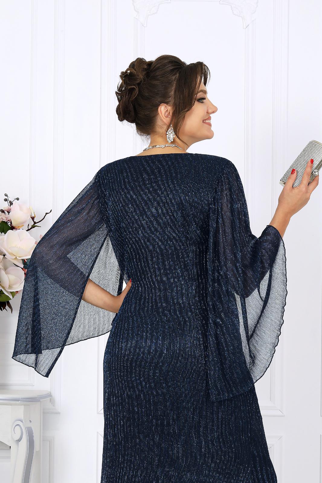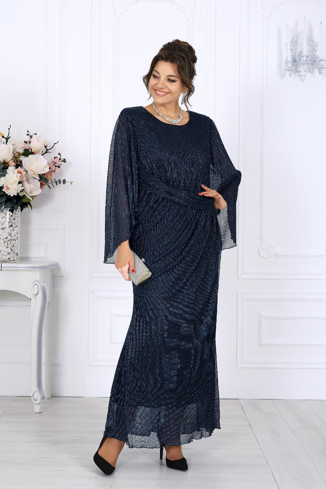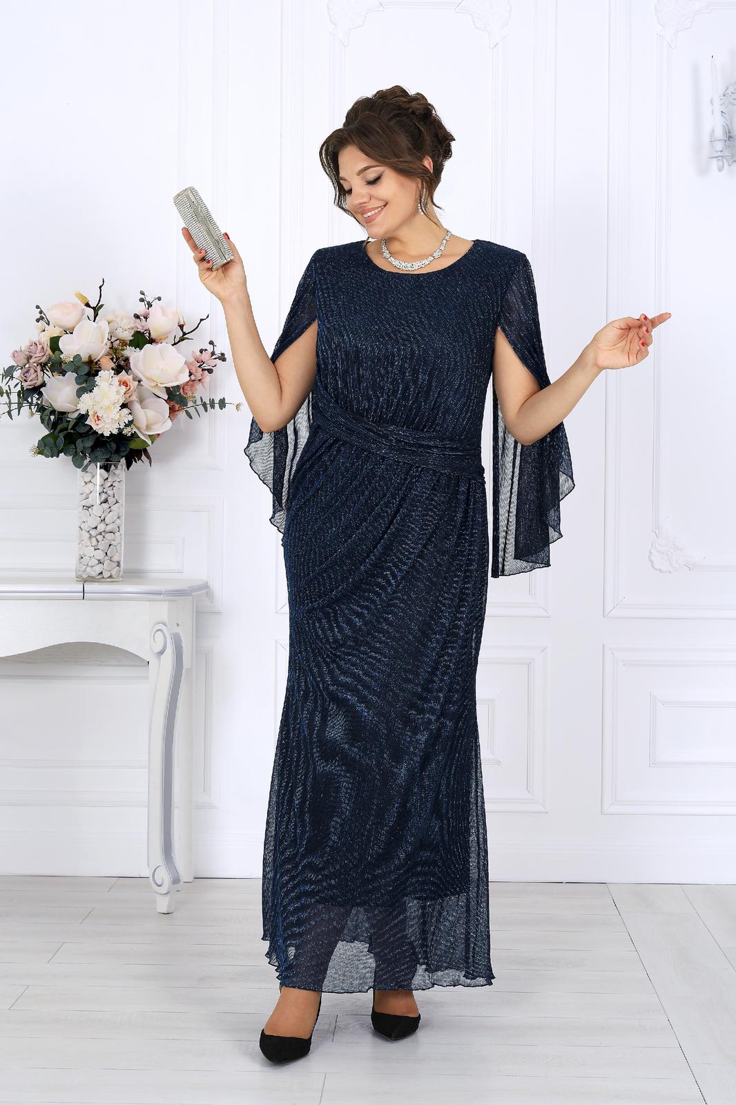 Платье женское, прилегающего силуэта с расширением к низу, выполнено из сетки-гофре с нитью «люрекс». Модель на трикотажной подкладке, без застежки, с плечевыми накладками. В верхней части переда косой подрез со сборкой; в шов подреза входит задрапированный декоративный элемент. На спинке обработаны талиевые вытачки. Вырез горловины переда и спинки округлой формы, по переду углубленный. Рукав без шва, с отлетными краями и фигурным низом, по окату сборка; крепится к пройме только в верхней части. Пройма окантована узкой косой бейкой из основного материала Длина платья – 140 см; длина рукава – 54 см.