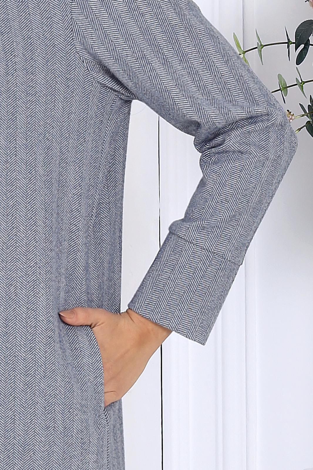 Платье женское прямого силуэта, выполнено из трикотажного полотна «елочка». Модель без подкладки, без застежки. В боковых швах платья обработаны карманы. По переду – имитация потайной бортовой застежки; от плечевых швов к центру груди направлены вытачки. Спинка со средним швом. Воротник пиджачного типа. Рукав втачной, длинный, с притачной, замкнутой манжетой по низу. Длина платья – 123 см.; длина рукава – 59 см