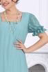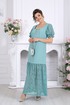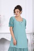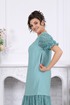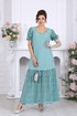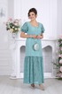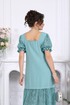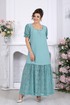 Платье женское, полуприлегающего силуэта. Модель с рельефными швами по переду и спинке, проходящими через центр груди, направленными вниз. По низу платья пришит волан из кружева, присборен по шву притачивания. Горловина по спинке и полочке прямоугольной формы, обработана обтачками. Для лучшего прилегания в горловину вставлена резинка, шириной 1 см. Застежка на потайную тесьму молнию расположена в левом боковом шве. Рукав втачной, короткий, на 5 см от низа настрочена резинка. Длина платья – 142 см (50-58 р-р.); длина рукава –23 см (50-58 р-р.).