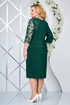 Платье женское, полуприлегающего силуэта, к низу чуть зауженное, отрезное по талии, на подкладке из дышащей, приятной на ощупь и достаточно эластичной ткани. Длина 112,0 см. от высшей точки плеча спинки. Деталь переда асимметричная, правый рельеф выходит из проймы, левый рельеф выходит из шва притачивания кокетки из гипюра. В подрез на талии вставлены обтачные баски, выходящие из-под шва левого рельефа. Спинка с талевыми вытачками, в среднем шве обработана застёжка на потайную тесьму молнию и шлица. На левой спинке фигурная кокетка с гипюром. Нижняя отрезная часть с прямыми рельефами. Горловина обтачная, углублённая спереди и чуть сзади. Рукава втачные, одношовные, длиной 44,0 см. Левый рукав из гипюра, правый рукав из ткани. Изделие с плечевыми накладками.