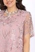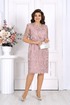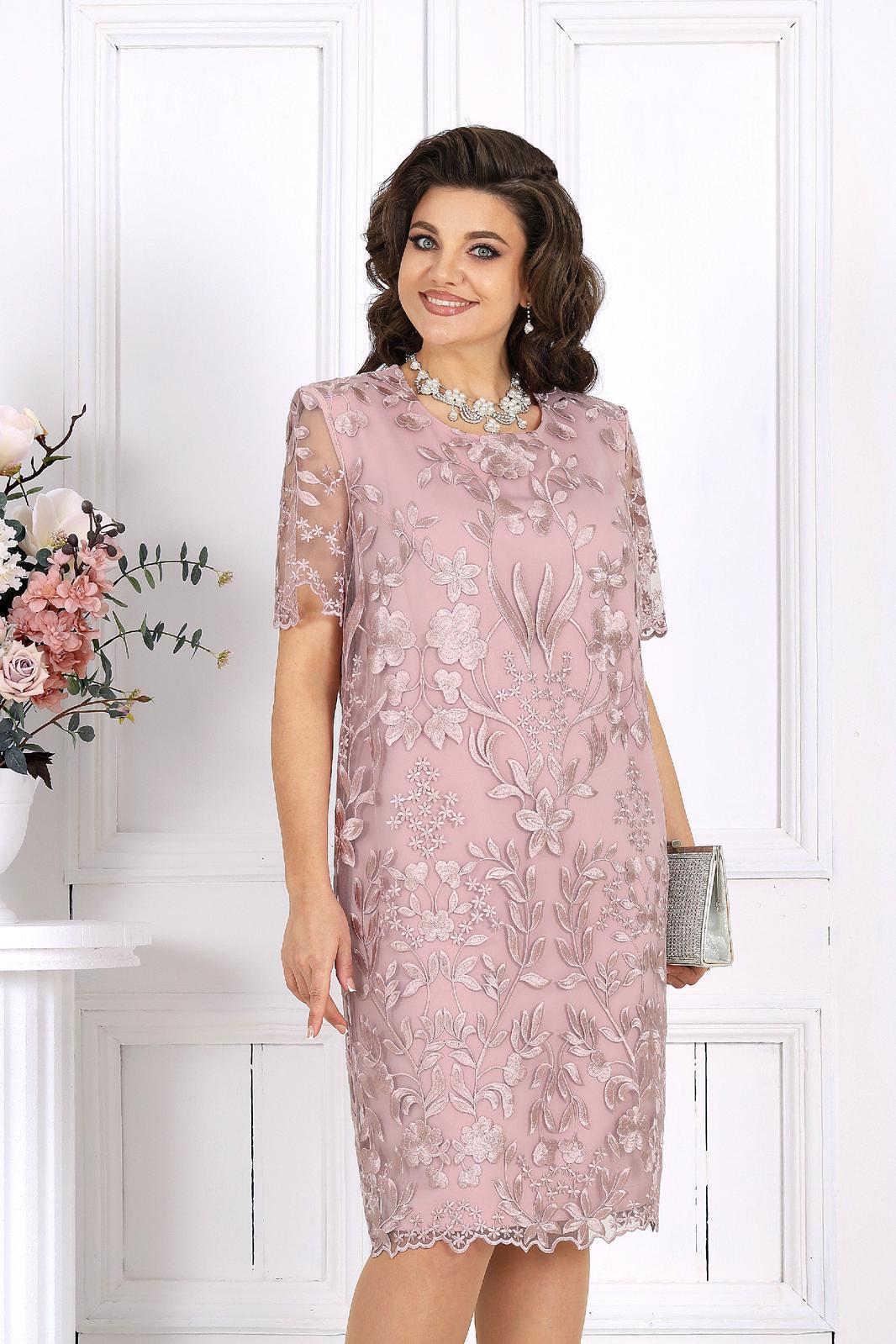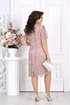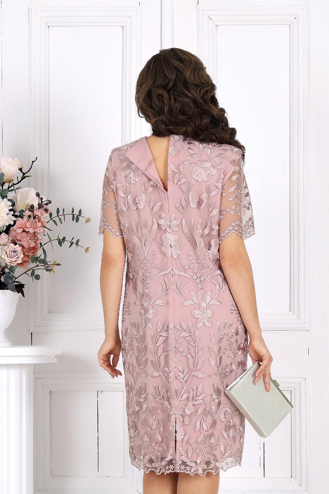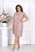 Платье женское, полуприлегающего силуэта, выполнено из гипюра и плательной ткани «сатин». Перед и спинка состоят из двух разных по длине слоев: нижний короче верхнего на 5 см. Модель без подкладки, с плечевыми накладками. Низ платья и рукавов оформлен фестонами. Перед в верхнем и нижнем слоях с нагрудными вытачками, выходящими из пройм. Спинка с талиевыми вытачками и средним швом, в верхней части которого обработана застежка на потайную тесьму-«молнию» (50см), в нижней – разрез. Вырез горловины переда и спинки округлый, углубленный по переду. Рукав короткий, втачной. Верхний и нижний слои платья скреплены по среднему шву, плечевым и проймам. Длина платья (верхний слой) – 104 см; длина рукава – 26 см.