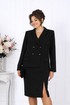 Особое внимание привлекает правая часть переда, стилизованная под двубортный жакет с декоративными пуговицами и аккуратными прорезными карманами с клапаном. Левая часть завершена кокетливым разрезом, добавляющим образу легкой смелости. Длинные втачные рукава и воротник пиджачного типа придают модели сдержанную классику.