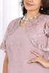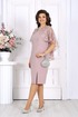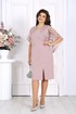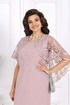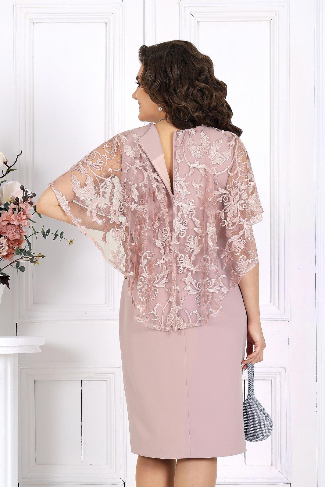 Платье женское, полуприлегающего силуэта, выполнено из костюмно-плательной ткани и гипюра. Модель на трикотажной подкладке, без рукавов и плечевых накладок. Перед отрезной по линии талии; на верхней части обработаны рельефы, направленные от пройм, на нижней – талиевая вытачка и рельефный шов с разрезом внизу. Лиф переда декорирован настрочной аппликацией. Спинка с талиевыми вытачками и средним швом, в верхней части которого обработана застежка на потайную тесьму-«молнию» (50см). Вырез горловины спинки округлый, по переду – углубленный, V-образный. В шов обтачивания горловины входит пелерина из гипюра, разъемная по середине переда и спинки; низ пелерины асимметричный, укороченный спереди. Длина платья – 104 см.
