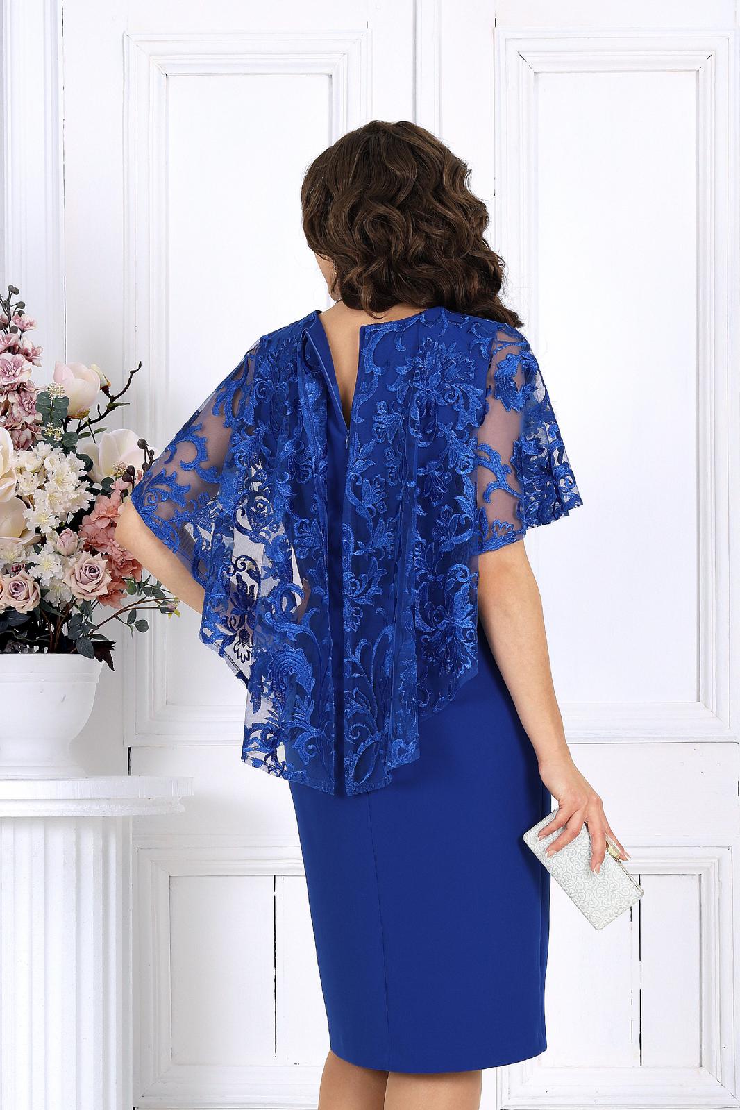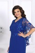 Платье женское, полуприлегающего силуэта, выполнено из костюмно-плательной ткани и гипюра. Модель на трикотажной подкладке, без рукавов и плечевых накладок. Перед отрезной по линии талии; на верхней части обработаны рельефы, направленные от пройм, на нижней – талиевая вытачка и рельефный шов с разрезом внизу. Лиф переда декорирован настрочной аппликацией. Спинка с талиевыми вытачками и средним швом, в верхней части которого обработана застежка на потайную тесьму-«молнию» (50см). Вырез горловины спинки округлый, по переду – углубленный, V-образный. В шов обтачивания горловины входит пелерина из гипюра, разъемная по середине переда и спинки; низ пелерины асимметричный, укороченный спереди. Длина платья – 104 см.