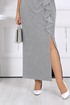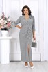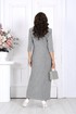 Платье женское полуприлегающего силуэта, выполнено из трикотажного полотна с фактурной лицевой стороной «люрекс». Модель на трикотажной подкладке, с плечевыми накладками и застежкой в левом боковом шве на потайную тесьму-«молнию» (35 см). Перед отрезной по линии талии. Верхняя часть переда состоит из двух деталей, скрепленных на запах; вдоль горизонтального подреза заложены односторонние складки. На нижней части переда обработан рельефный шов с двойным воланом в верхней части и разрезом по низу; от шва к центру направлены односторонние складки. На спинке обработаны талиевые вытачки. Рукав трехчетвертной. Платье дополнено съемным «цветком» из основного полотна. Длина платья – 134 см; длина рукава – 42 см.