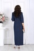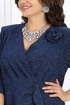 Платье женское полуприлегающего силуэта, выполнено из трикотажного полотна с фактурной лицевой стороной «люрекс». Модель на трикотажной подкладке, с плечевыми накладками и застежкой в левом боковом шве на потайную тесьму-«молнию» (35 см). Перед отрезной по линии талии. Верхняя часть переда состоит из двух деталей, скрепленных на запах; вдоль горизонтального подреза заложены односторонние складки. На нижней части переда обработан рельефный шов с двойным воланом в верхней части и разрезом по низу; от шва к центру направлены односторонние складки. На спинке обработаны талиевые вытачки. Рукав трехчетвертной. Платье дополнено съемным «цветком» из основного полотна. Длина платья – 134 см; длина рукава – 42 см.