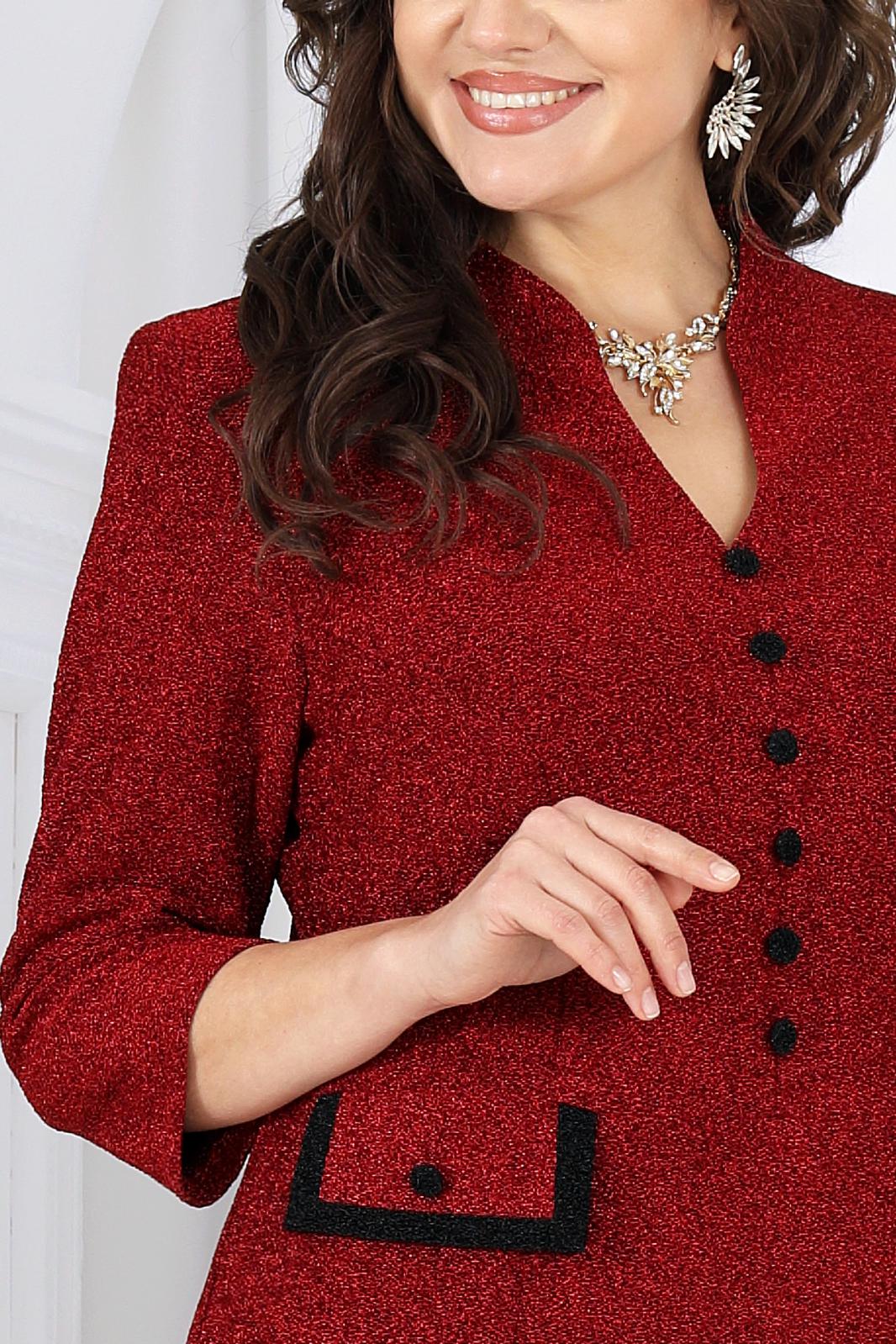 Платье женское, полуприлегающего силуэта, выполнено из трикотажного полотна с фактурной лицевой стороной «люрекс». Модель на трикотажной подкладке, с плечевыми накладками. Перед отрезной по линии талии: на верхней части обработаны рельефы, направленные от пройм, V-образный вырез и средний шов, декорированный пуговицами; на нижней части обработаны талиевые вытачки и настрочены клапаны с бейками по краю и пуговицами по центру. Спинка отрезная по линии талии; на верхней части обработаны рельефы, направленные от пройм, на нижней – талиевые вытачки и средний шов со шлицей. Горловина оформлена стойкой с закругленными концами. Застежка на потайную тесьму молнию расположена в среднем шве спинки и переходит на стойку. Рукав втачной, трехчетвертной. Бейки клапанов и обтяжные пуговицы выполнены из отделочного трикотажного полотна. Длина платья – 106 см; длина рукава – 45 см.