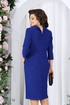 Платье женское, полуприлегающего силуэта, выполнено из трикотажного полотна с фактурной лицевой стороной «люрекс». Модель на трикотажной подкладке, с плечевыми накладками. Перед отрезной по линии талии: на верхней части обработаны рельефы, направленные от пройм, V-образный вырез и средний шов, декорированный пуговицами; на нижней части обработаны талиевые вытачки и настрочены клапаны с бейками по краю и пуговицами по центру. Спинка отрезная по линии талии; на верхней части обработаны рельефы, направленные от пройм, на нижней – талиевые вытачки и средний шов со шлицей. Горловина оформлена стойкой с закругленными концами. Застежка на потайную тесьму молнию расположена в среднем шве спинки и переходит на стойку. Рукав втачной, трехчетвертной. Бейки клапанов и обтяжные пуговицы выполнены из отделочного трикотажного полотна. Длина платья – 106 см; длина рукава – 45 см.